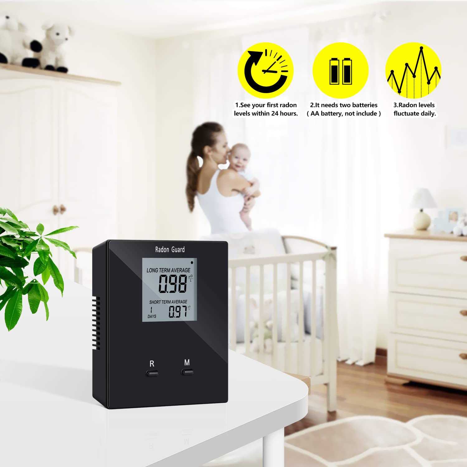 Do you want to know if your home have too much radon? Long term monitoring is necessary as radon levels fluctuate daily, to help you take more effective measures to prevent radon exceedance BE IN CONTROL: On-screen results show both long and short term readings, take action if your radon levels are high. It can be easily detected from room to room without needing to be recharged, making it easy to detect radon gas in your home, office, school, basement, or anywhere else KEEP HEALTH: Your home could be susceptible to a radon problem, so radon gas detector is required in every family because there is no guarantee that radon levels in your home will be lower than 2pCi/L. Especially in the family of infants, the elderly, pregnant women or sensitive people Is your family safe from Radon? Is your family safe from Radon? Although radon gas cannot be seen, smelled, or tasted, it is still possible for individuals to be exposed to harmful levels of it in their homes. Approximately 21,000 deaths per year in the United States are linked to radon gas. It is estimated that one out of every 15 homes in the US has levels of radon that are considered to be dangerous (over 4 pCi/L). Detection of radon gas is important. Remember to monitor radon daily so that you can make small adjustments to improve the quality of your air Specification: Sampling Method: Passive radon diffusion chamber Detection Method: Alpha spectrometry Power Supply: Rechargeable battery Operation Environment Temperature: 32 ~ 104°F Relative Humidity: <85% Measurement Range: 0 - 9999 pCi/L Accuracy: 5% ± 0.14 pCi/L