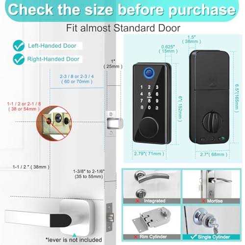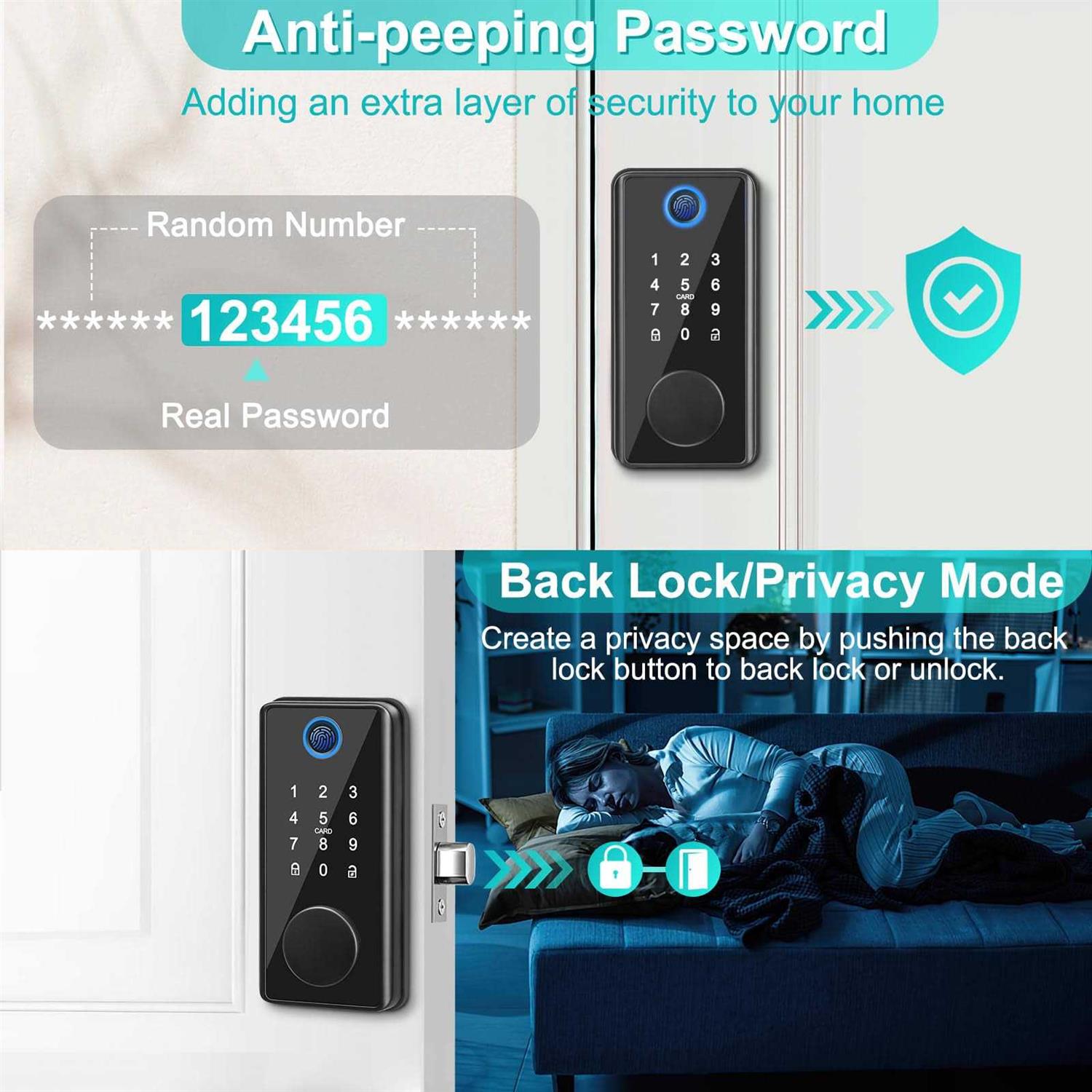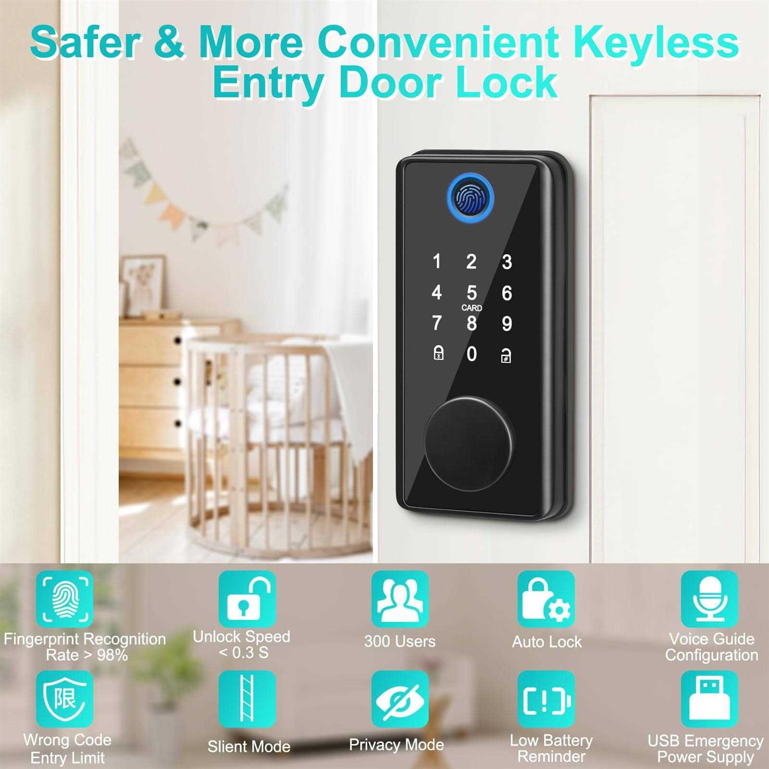 Convenient and Adaptable 5-in-1 Smart Door Locks: Fingerprint recognition in 0.3s, touch screen password unlock, app unlock, mechanical key unlock(2 Pcs), IC card unlock(2 Pcs). This smart door lock supports to add 100 fingerprints, 100 group passwords, 100 pcs IC cards. You can choose any method to unlock your door. The multi-functional door lock makes your life more convenient and secure. APP Control Easily: You can lock/unlock the door, check log records and authorized admin via Tuya APP. You also can remotely generate a one-time PIN code and easily share the one-time PIN code for your friends and family members, or anyone you want. Effortlessly grant access to visitors or service personnel without the need for physical keys. (No any fees charged for the APP) Auto Lock & One-Touch Locking: This keyless entry smart door lock can set to be locked automatically in custom-setting time (5s-60s) after the door closed while you leave home in hurry. Or you can click the “lock icon” on the panel to lock it immediately. Anti-Peeping Password & Anti-Lock: Adding random numbers before or after the correct password can also unlock the door to prevent the password from prying eyes. Anti lock function set on the backside lock handle and only support the Admins to unlock it, so that you can enjoy your own private space without being disturbed by others. Security and Durability: This smart door lock is equipped with a low battery alert, privacy mode, hidden keyhole and other security functions to ensure the safety of your home at all times. Place palm over the lock to wake up the keypad easily. Operating temperatures range from -13°F to 158°F (-25°C to 70°C), door lock can be installed indoor or outdoor. IP53 Waterproof. Easy Installation: This electronic door lock compatible with most standard US left handed and right handed doors, which can be easily installed with no drilling. Suitable for doors in various scenarios. You can set the door lock direction on the APP, or switch the left and right door directions on the smart lock easily. p Silent Mode /b br br You can adjust the volume of voice guidance on the keyboard of the door lock, or set it to silent mode to avoid disturbing other people. – Suitable for Indoor and Outdoor /b br br This smart door lock has great high temperature resistance and low temperature resistance, and has an IP53 dust-proof and water-proof rating. Suitable for both indoor and outdoor use. Operating temperatures range from -13°F to 158°F (-25°C to 70°C). – Emergency Unlock Mode /b br br Unlock your Smart door lock using a Type-c charge when it is out of power. With low power consumption of keypad deadbolt, 4*AA batteries( Not included )can last for 365 days. It also has low power alarms, so don’t worry about forgetting to change the battery. /p