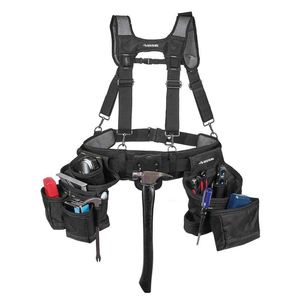 Husky 16-Pocket Black Carpenter’s Tool Belt with Suspenders