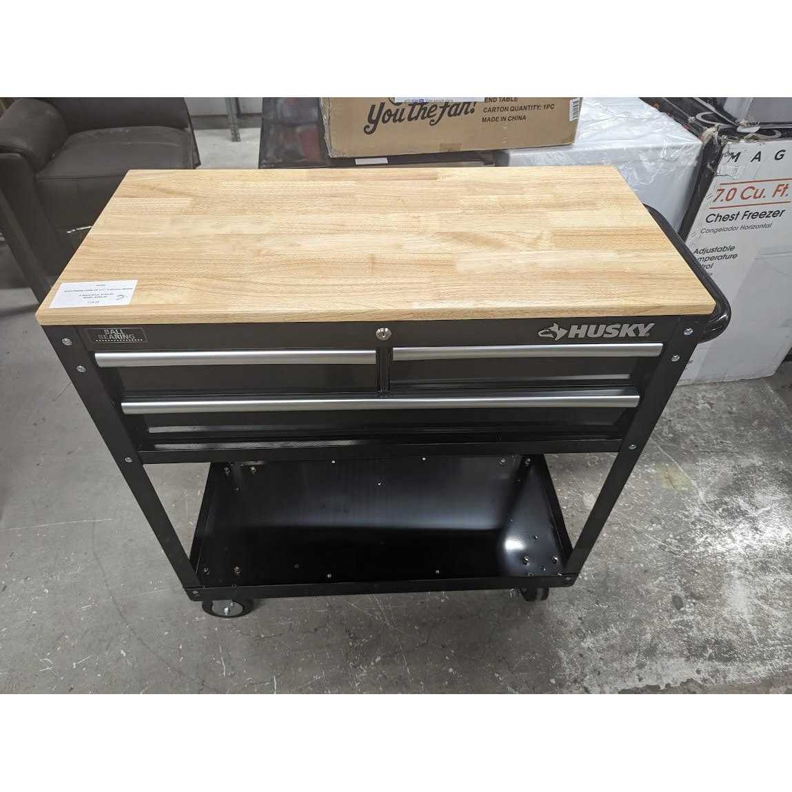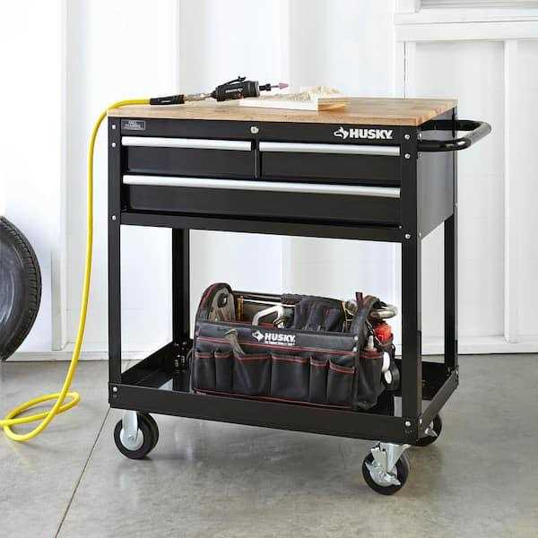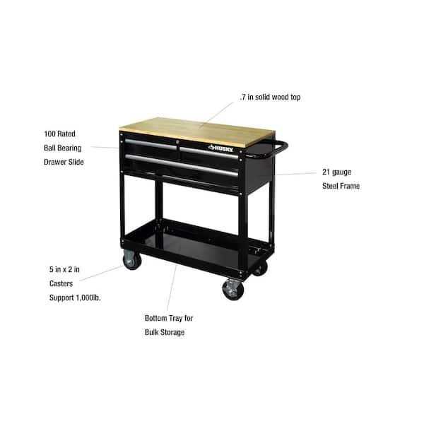 Solid wood top makes a perfect work surfaceVersatile storage options for trays and drawersEasier to assemble with premounted, threaded bolts The Husky 36 in. 3-Drawer Tool Cart is the perfect combination of a mobile work center and a mechanic’s tool cart. The fixed wood top is made of solid parawood, which provides a durable work surface that is both stylish and practical. The 3 drawers have 50 lbs. rated ball bearing slides to hold a variety of tools. The bottom storage tray is reinforced steel for your larger, heavier items. With no clumsy washers and nuts to deal with, this tool cart can be assembled in minutes with the included bolts and pre-installed speed nuts.