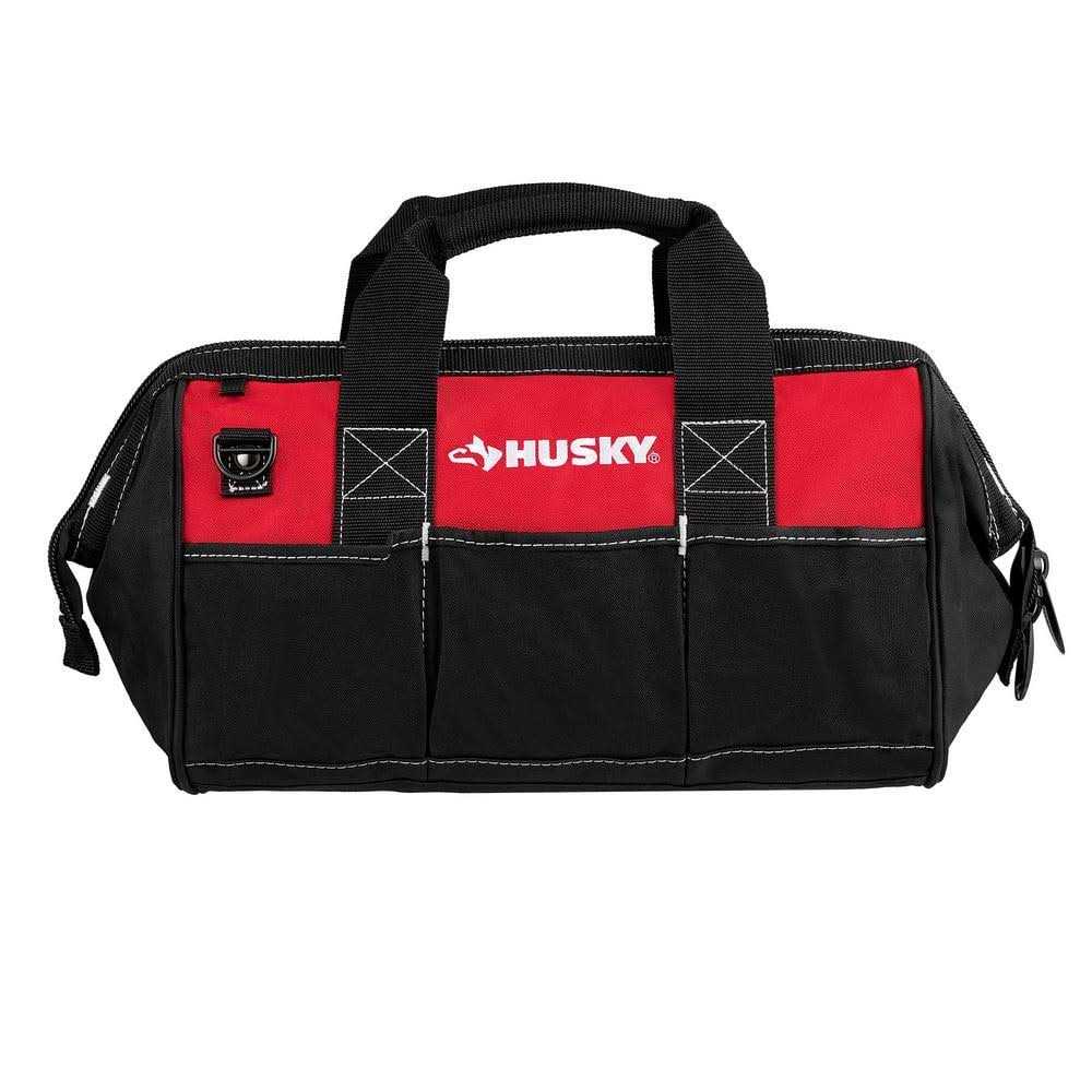 Tool Bag is constructed of 600 Denier water-resistant material which will last you many years of use. This tool bag also features a wide mouth for easier access to large, interior pockets for more storage . The Huksy 15 in. tool bag is great for storing your hand tools, small parts, accessories, and more at home or on the job site. The zippered top and metal hardware can hold up to 30 lbs. This tool bag also includes a shoulder strap and can be stacked on top of your Husky rolling tool tote or paired with your favorite Husky tool storage pouch or belt. Color: Red/Black.