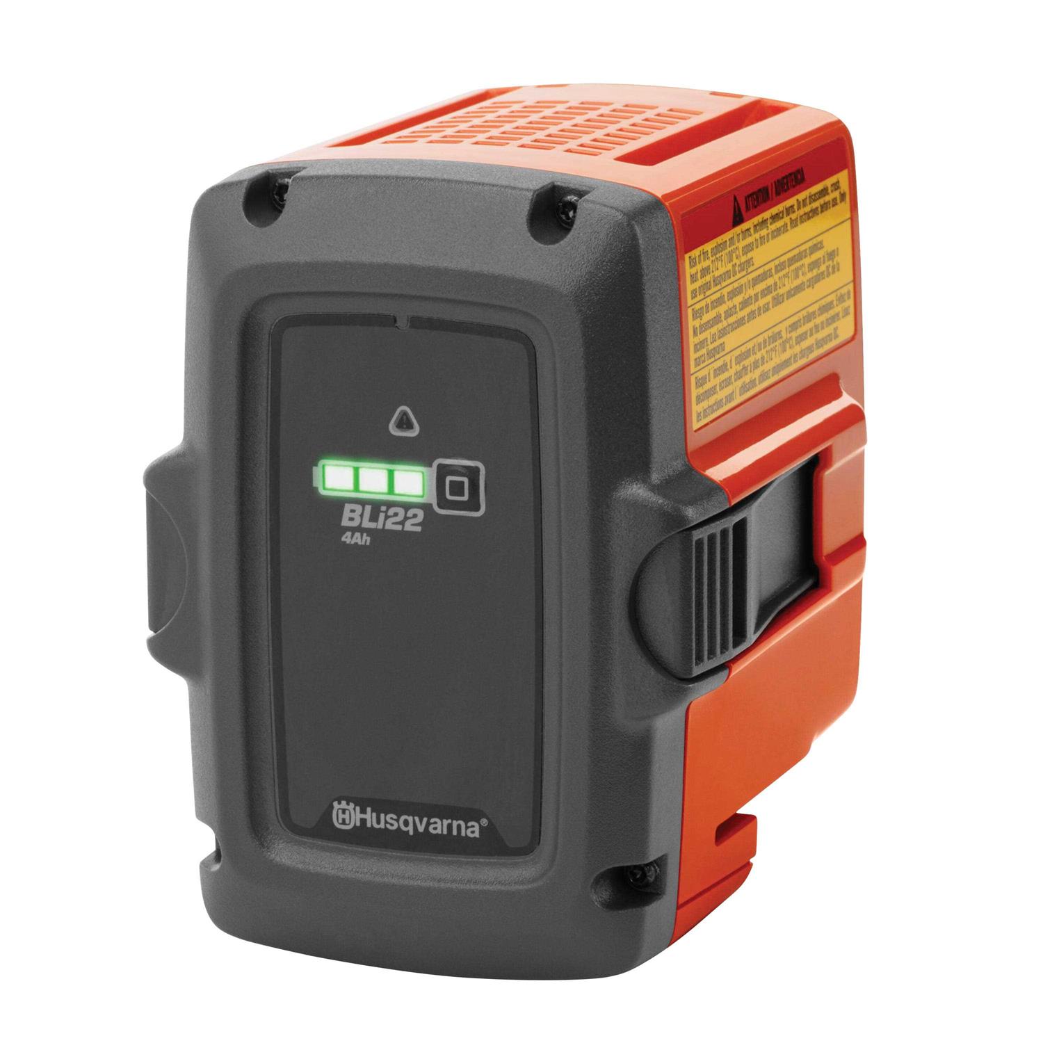 The Husqvarna BLi22 rechargeable Li-Ion battery is suitable for home use. It offers high capacity for extended runtime and is designed for use with the Husqvarna 100 Series, including battery chainsaws. 4 Ah battery capacity, 36V voltage, excellent cooling and intuitive 3-LED charge indicator.