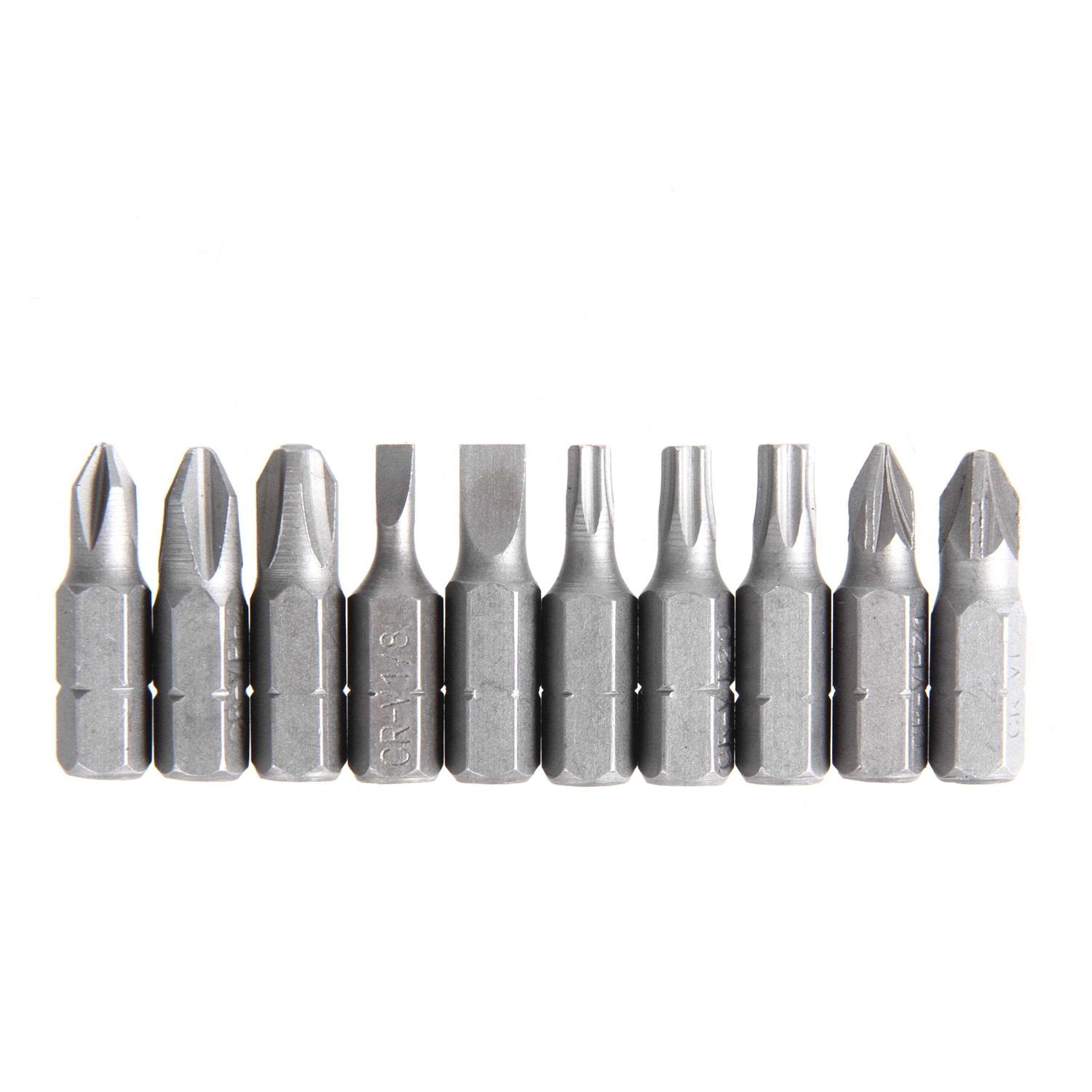 These hex shank bits are ideal for use with your drill or impact driver. These bits are made from heat treated chrome vanadium steel for durability and long life. The set include Phillips sizes, PH1, PH2 and PH3; Star sizes T15, T20, T25; PZ1, PZ2 and slotted 1/8-inch and 3/16-inch. These high-quality bits are useful driving long screws into both soft and hard woods. They can handle high amounts of torque without breaking.”
