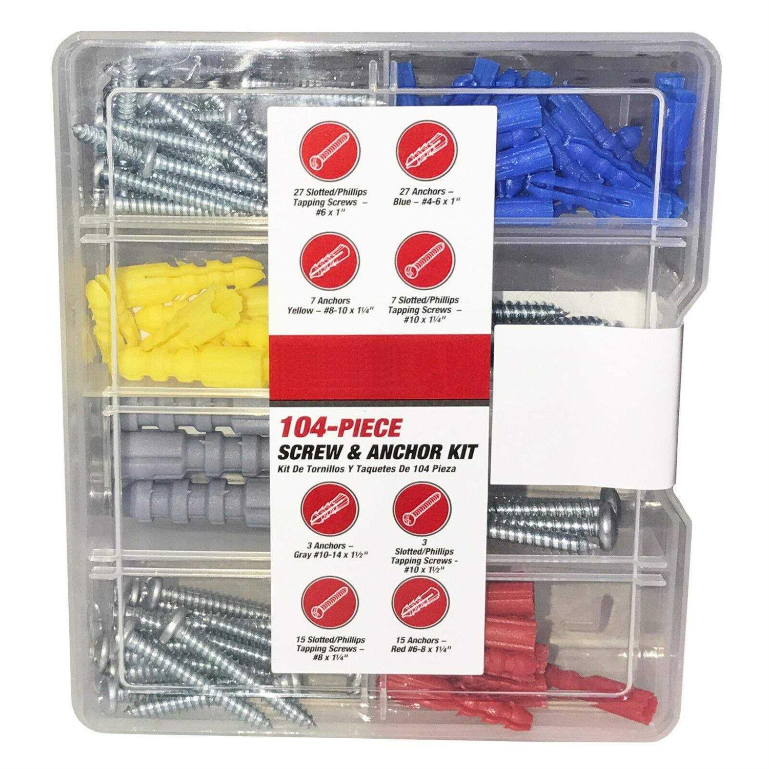 A variety of sizes to suit your needs Comes in a handy reusable plastic container 104 piece per pack KIT INCLUDES: 27 – Slotted / Phillips Tapping Screws #6 x 1″, 27 – Anchors #4-6 x 1″ BLUE, 7 – Slotted / Phillips Tapping Screws #10 x 1-1/4″, 7 – Anchors #8-10 x 1-1/4″ YELLOW, 3 – Slotted / Phillips Tapping Screws #10 x 1-1/2″, 3 – Anchors #10-14 x 1-1/2″ GRAY, 15 – Slotted / Phillips Tapping Screws #8 x 1-1/4″, 15 – Anchors #6-8 x 1-1/4″ RED Great kit for the home or workplace. Contains an assortment of sizes screws and anchors. A variety of sizes to suit your needs. KIT INCLUDES: 27 – Slotted / Phillips Tapping Screws #6 x 1″, 27 – Anchors #4-6 x 1″ BLUE, 7 – Slotted / Phillips Tapping Screws #10 x 1-1/4″, 7 – Anchors #8-10 x 1-1/4″ YELLOW, 3 – Slotted / Phillips Tapping Screws #10 x 1-1/2″, 3 – Anchors #10-14 x 1-1/2″ GRAY, 15 – Slotted / Phillips Tapping Screws #8 x 1-1/4″, 15 – Anchors #6-8 x 1-1/4″ RED