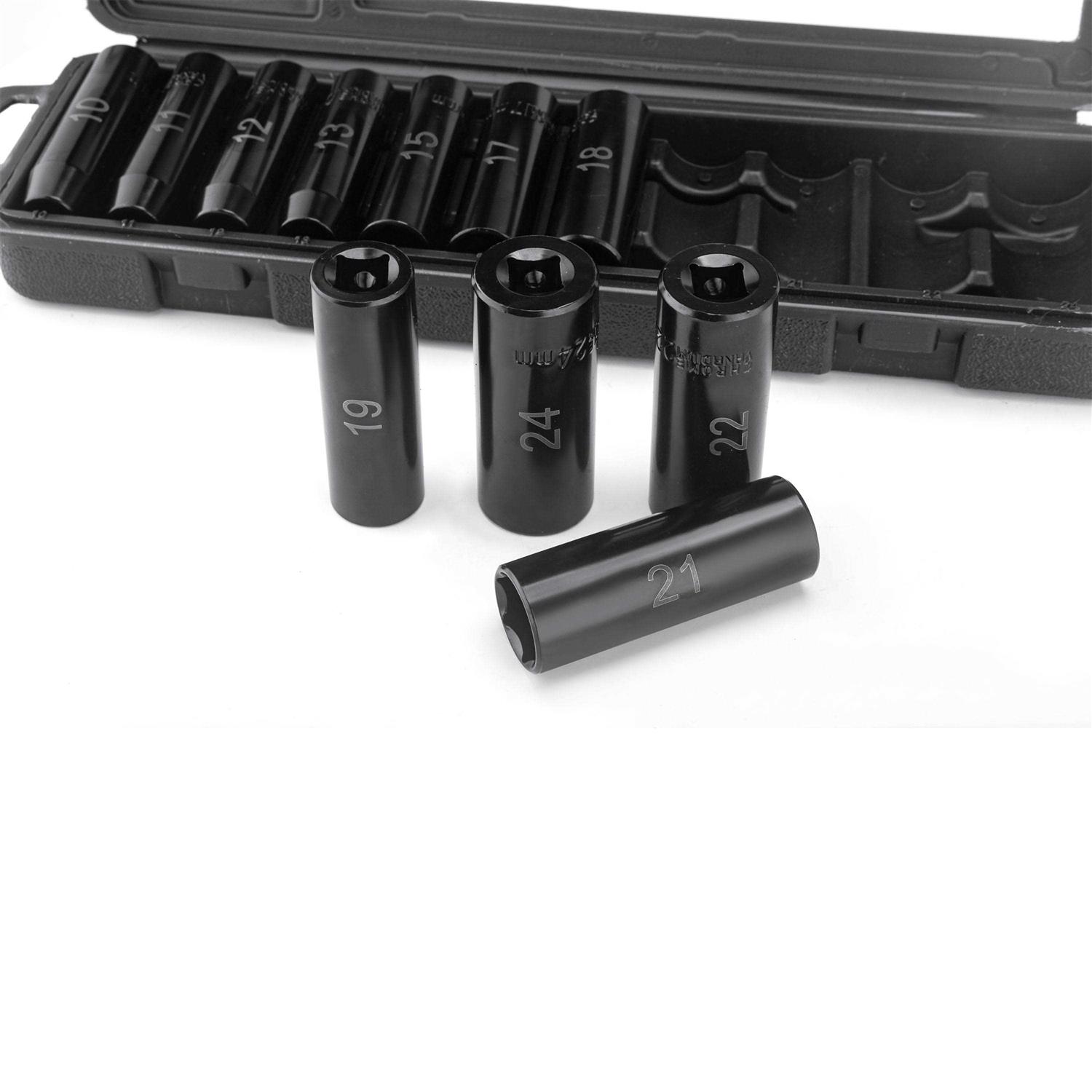 Perfect when working on bolted joints or recessed fasteners, these durable vanadium steel deep sockets are chamfered for fast and easy loading on fasteners and drive tools. A black oxide finish resists rust and corrosion, and large size markings are stamped clearly on each socket.