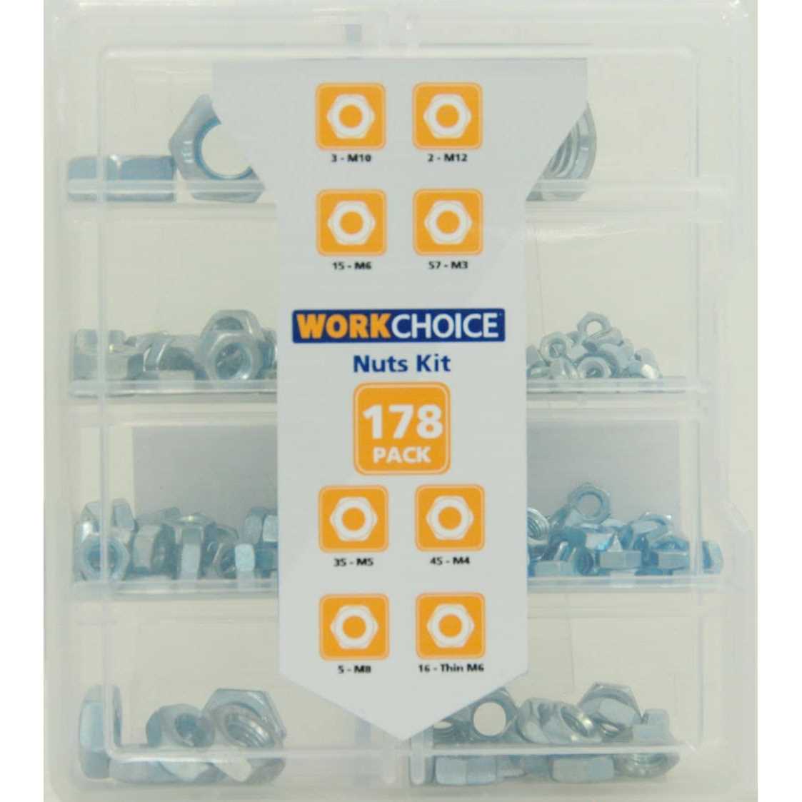 Keep it handy for fastening bolts and screws. The WorkChoice nuts kit has 178 pieces in a wide range of sizes so you can prepare for a variety of different jobs. They are packed in a convenient plastic case and are sorted into individual compartments based on size. The case uses a simple latch that is easy to open and close. Use this kit for woodworking, building furniture, mechanical and automotive work and many other tasks.