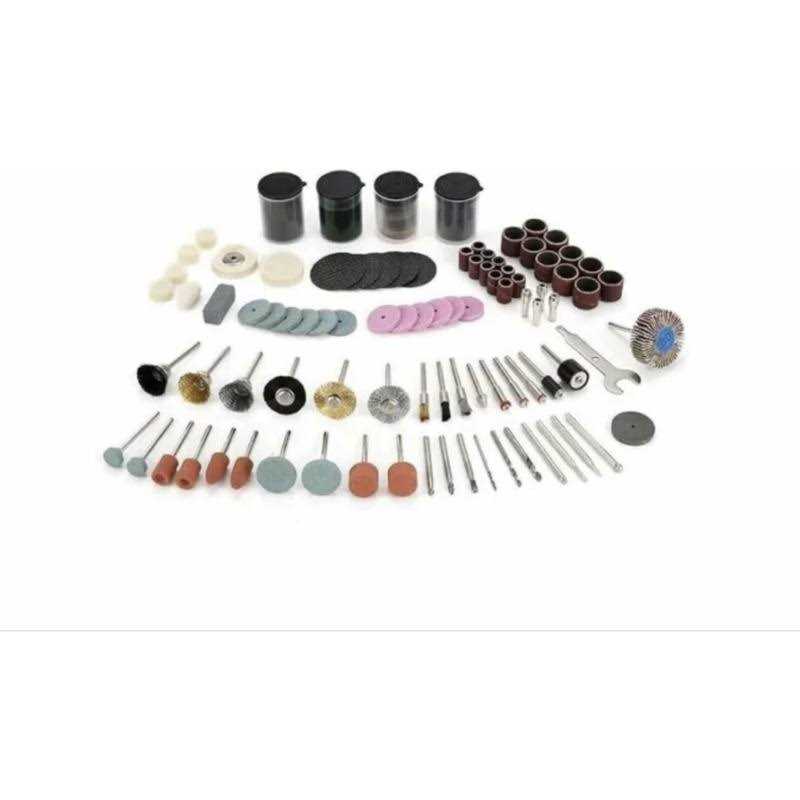 This rotary tool accessory set is 1.35 lb. and consists of 20 sanding bands, 1 cloth wheel, 6 felt wheels, 1 rubber emery wheel, 3 high speed HSS drill bits, 2 sanding shanks, 4 diamond cutters, 3 HSS cutters, 10 grinding wheels with shank, 12 grinding wheels, 3 plastic brushes, 3 wire wheel brushes, 3 brass brushes, 1 polishing compound, 30 heavy duty cut off wheels (cutting discs), 46 regular cut off wheels, 44 sanding discs, 4 replacement collets, 2 mandrel cut off wheels, 1 mandrel for cloth wheel, 1 mandrel for felt wheels, 5 fiberglass cut of wheels, 1 flap wheel and 1 wet stone.