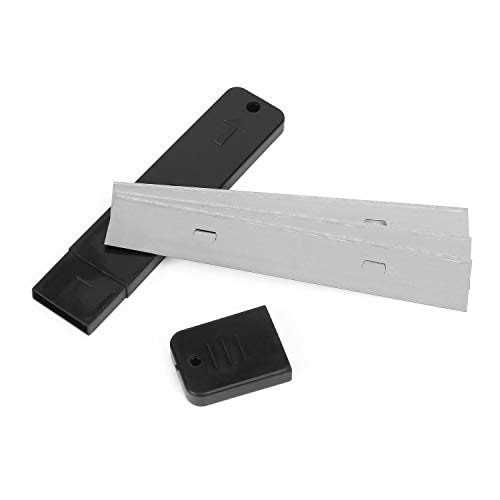 Hyper Tough 4 in Soft Grip Glass and Tile Scraper is a great tool for scraping hard surfaces such as glass and tiles. It comes with three replacement 4-inch blades which are made of durable carbon steel. The extra blades can be stored in a separate plastic case which is neatly hidden inside the handle. The blade changing mechanism is easy to open and close, making blade replacing very convenient. This scraper has a durable plastic and non slip rubber handle which feels solid and comfortable in hand.