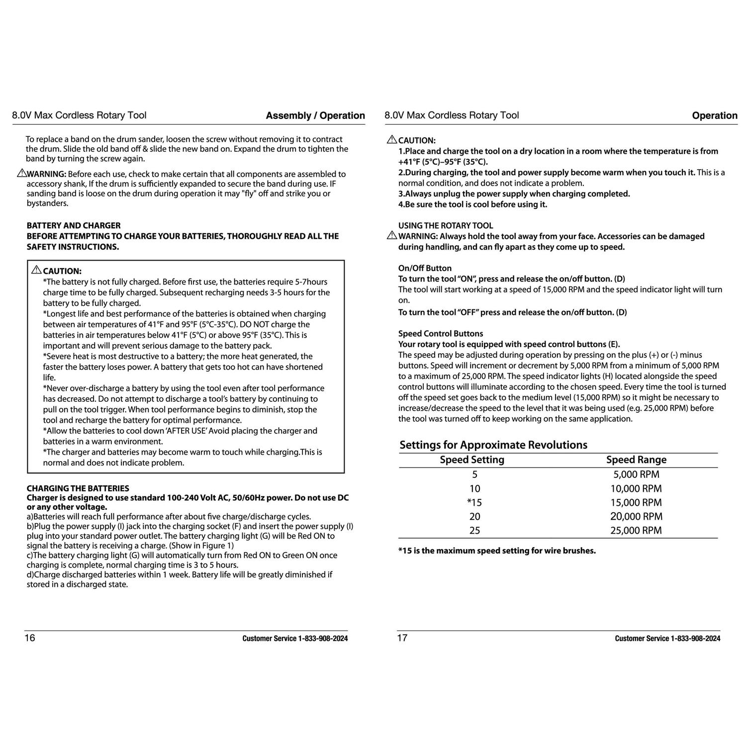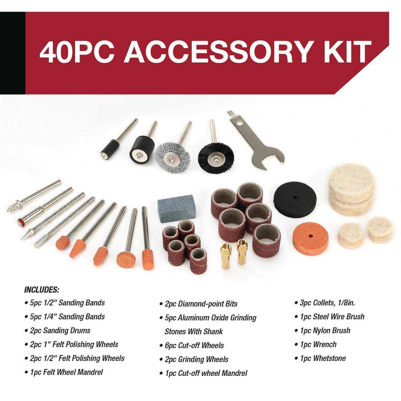 The New Hyper Tough 8-Volt Lithium Ion Rotary Tool with 40 Accessories has the portability and functionality you need in a Battery operated rotary tool to give you more versatility on more home improvement projects than you could have possibly imagined. Whether it is to clean, cut, sharpen, grind, engrave, sand, polish or carve, you will be prepared to take it all on. A diamond-point bit, sanding bands, a grinding wheel and polishing wheel, a sanding drum, cut-off wheels, wire and nylon brushes and more are just a taste of everything included.
