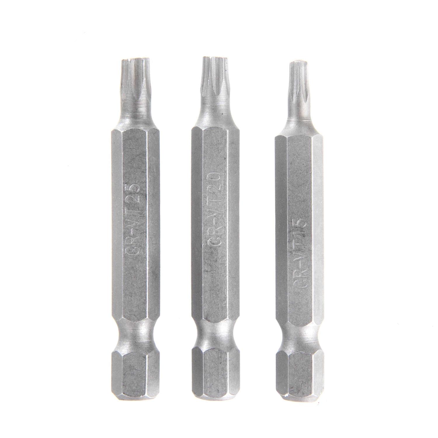 These hex shank bits with 1/4-inch quick connect are ideal for use with your drill or impact driver. These bits are made from heat-treated chrome vanadium steel for durability and long life. The set include one each of the most commonly used Star sizes, T15, T20, and T25 . These high-quality bits are useful driving long screws into both soft and hard woods. They can handle high amounts of torque without breaking. The extra length also allows screws to be recessed without damaging the surface from the drill chuck. The hardened tips have a precision ground head to assure a tight fit in the screw head which will reduce the chance from falling off and damaging the screw head.”