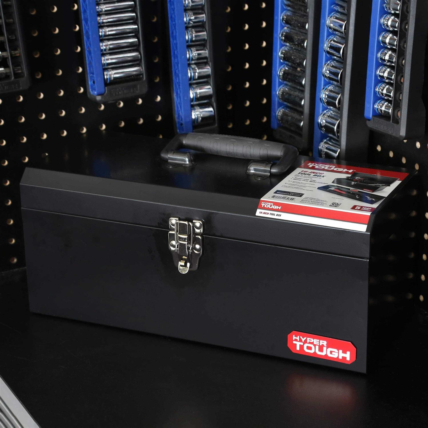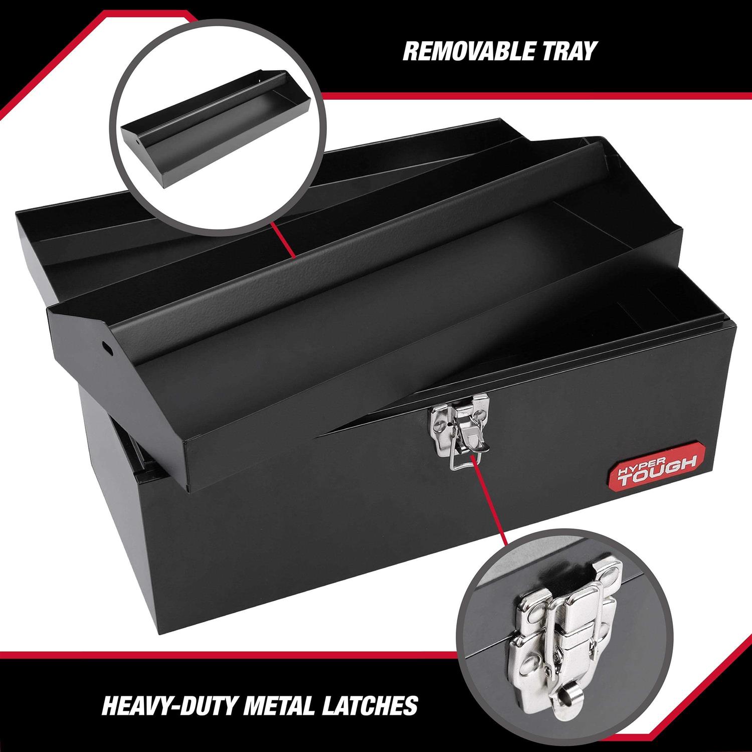 This Hyper Tough 16-Inch Black Metal Toolbox with Removable Tray (model 3482V) allows for convenient storage and portability of your tools. The tool box has many high quality features like a lockable metal latch and removable metal tray. The unit is made from heavy gauge steel with a hinge that runs the full length of the box and is finished with powder coat paint for long lasting use and durability. This tool box provides convenient storage and organization of your most commonly used tools.