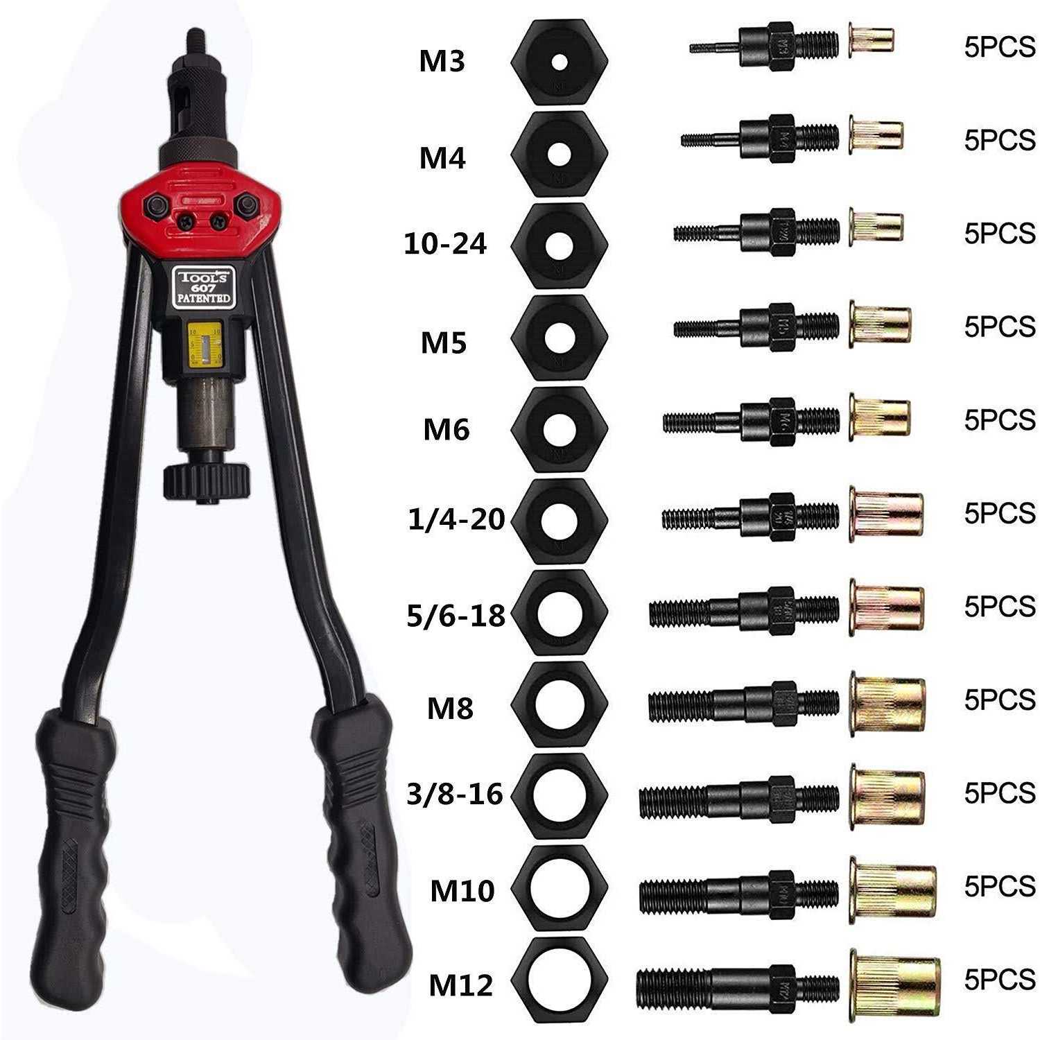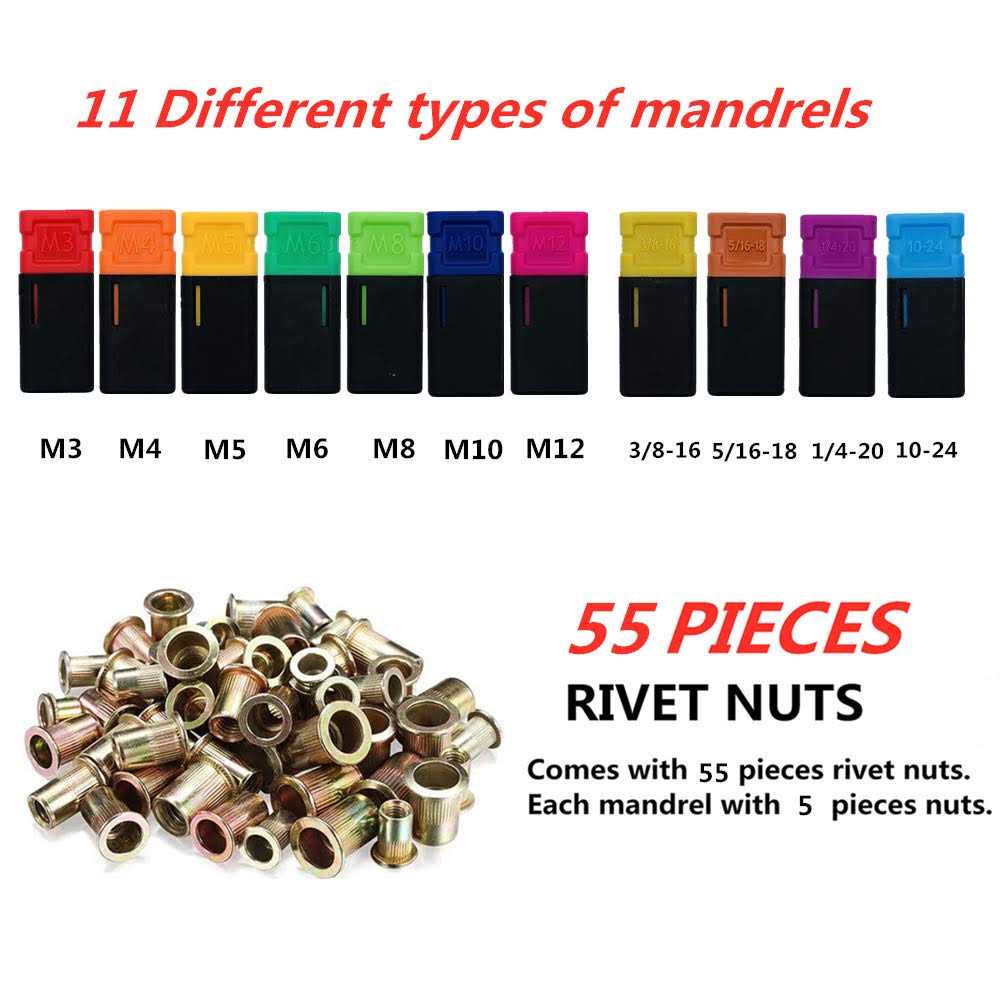 The rivet and nut tool combines multiple design concepts, is simple to use and labor-saving,100% new and of high quality. The tool is made of thick carbon steel and is heat treated. Excellent design structure and rigid materials extend service life. A wide range of applications can be reinforced, such as body panels, bicycle accessories, furniture and accessories, especially for off-road/jeep modifications All accessories are complete – 11 interchangeable mandrel (metric M3 M4 M5 M6 M8 M10 M12; SAE 10-24, 1/4-20, 5/16-18, 3/8-16) and 55 rivet nuts (5 nuts per mandrel). Please note that the M8 mandrel has been installed on the riveting machine.