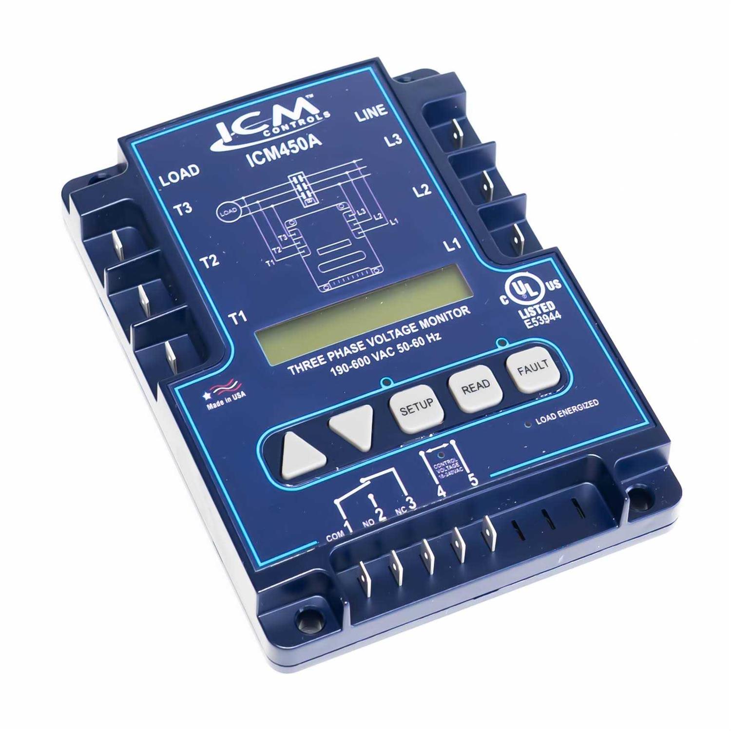 ICM450A Programmable 3 Phase Line Voltage Monitor The ICM450A is the latest 3-phase offerings, providing superior motor protection from premature failure and damage caused by common voltage faults such as phase unbalance, over/under voltage, phase loss and phase reversal. A design upgrade from our flagship ICM450, this newest model features an easy to read, backlit display that makes quick work of adjusting the variable settings to better tailor the unit to the application. Common spade terminations eliminate the potential for exposed wires and allow for a better and safer connection. It also includes a menu options for English and Spanish readouts. The ICM450A is proudly manufactured in the USA by ICM Controls Features: Backlit LCD Simultaneous 3-phase true RMS voltage monitoring Factory calibrated 3-phase voltages simultaneously displayed on LCD Fault memory Fault monitoring: High / low voltage, voltage unbalance, phase loss, phase reversal Simple configuration Fully adjustable variables LED indicators Common quick connect terminations English or Spanish menu options Specifications: INPUT: Line Voltage: Universal, 190-600 VAC Frequency: 50-60 Hz Load Side Monitoring: Optional Control Voltage: 18-240 VAC OUTPUT: Type: Relay, SPDT Voltage Range: 277 VAC @ 6A maximum CONTROL OPERATING TEMPERATURE Operating Temperature: -40F to +149F (-40C to +65C) Storage Temperature: -40F to +185F (-40C to +85C) MECHANICAL: Mounting: Surface mount using (2) #8 screws Terminations: 1/4 quick connects Weight: 12 ounces (341 grams) Dimensions: 6.5 x 4.75 x 1.09 Replacement for: A-1: EAC-800, EAC-8000, EAC-8002, Copeland: 085-0160-00, Diversified: AC-2020, AC-301, AC-302, Mars: PFM-2000, Motorsaver: 455, SSAC: QLM, QLV REPLACES, Time Mark: 265, Wagner/DiversiTech: DTP-3, WPC-800