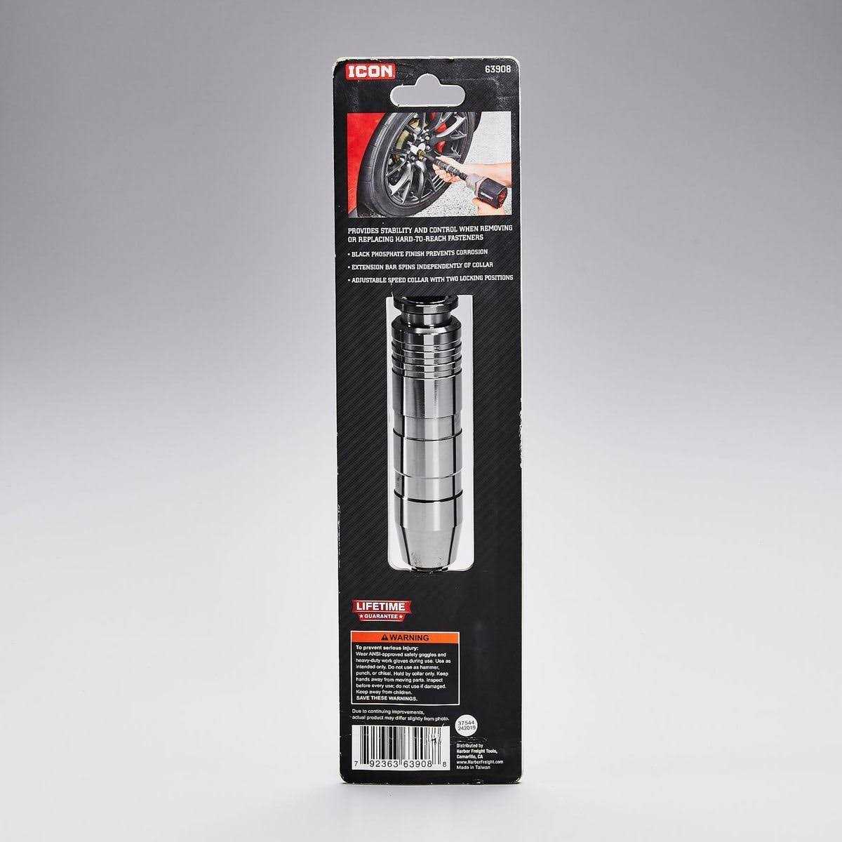 The ICON Speed Collar Extension Bar is equipped with a two-position adjustable grip to maintain alignment and control while removing and replacing hard to reach fasteners. The speed collar adjusts to two different positions for ultimate control and multi-application use. The narrow nose on the speed collar extension reaches deep-set lugs without damaging rims.