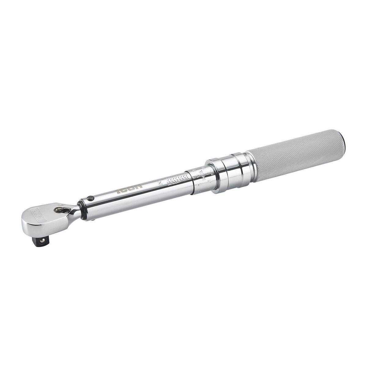 The Icon professional compact click-type torque wrench is fast, accurate and easy to adjust. This high accuracy torque wrench comes with a factory certificate of calibration and can be re-calibrated. Its compact design allows easy clearance into the most cramped work areas. This torque wrench is perfect for cars, motorcycles and small engine repairs. The easily readable scale is roll-marked for permanence and is equipped with a locking collar to prevent accidental changes to torque settings. The mechanism provides a physical impulse and audible click when the correct torque setting is reached.