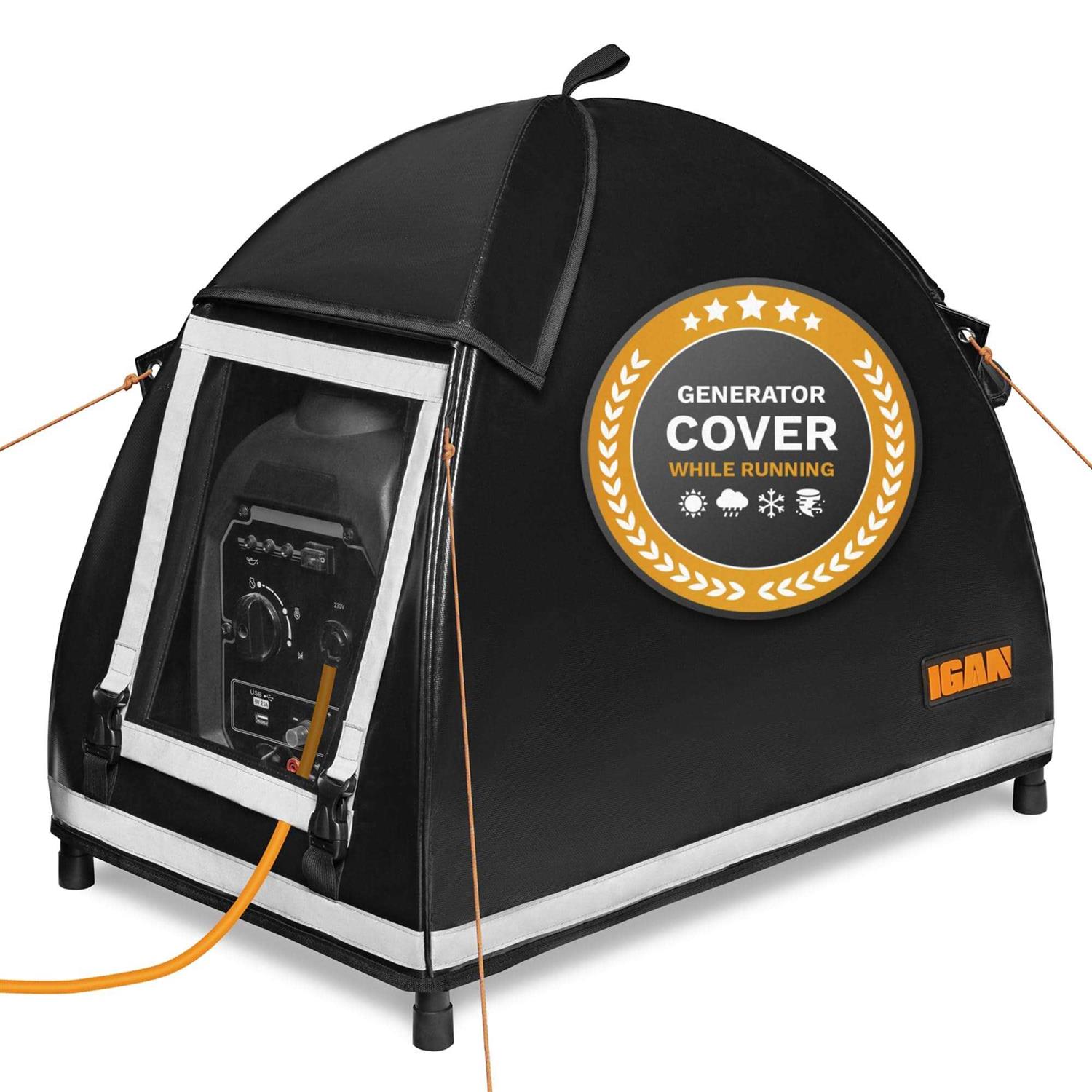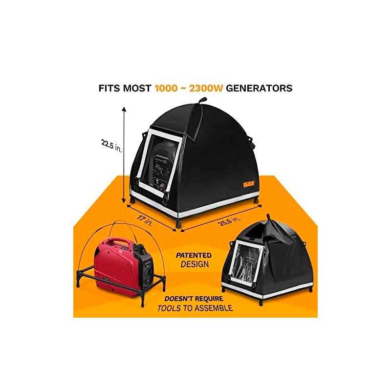 IGAN Inverter Generator Cover While Running Protects your generator investment during inclement weather. A revolution in generator running cover, with strong protection, toolless installation is designed for inverter generators from 1000 to 2300 watts, and allows you to operate your generator safely outside in nearly any type of weather. Operational Safety US patent, a multi-function running cover designed for small inverter generators. Operate your 1000 to 2300 watt inverter safely whether in rain, snow, high winds or wet weather. While avoiding CO poisoning, electrocution and generator damage. Durable & All weather resistance Heavy-duty & 100% waterproof tarpaulin can keep the outlets covered and dry while in use. The sloping roof canopy at the rear extends outwards to provide natural airflow and would not block the exhaust vent. Convenient IGAN leading design allows you to easily start, plug in and refuel the inverter without removing the cover. Featuring with huge TPU transparent electric panel cover, to know the status of the generator anytime and anywhere. Windproof and non-slip performance 1. Non-slip rubber feet. 2. Heavy-duty metal frame base. 3. Featuring 4 outdoor tent stakes and ropes. Multipurpose The IGAN generator tent can be used as a storage and running cover. Important Note This model is only for fully encased small inverter generators up to 2300 watts. Not fit for open framed portable generators.