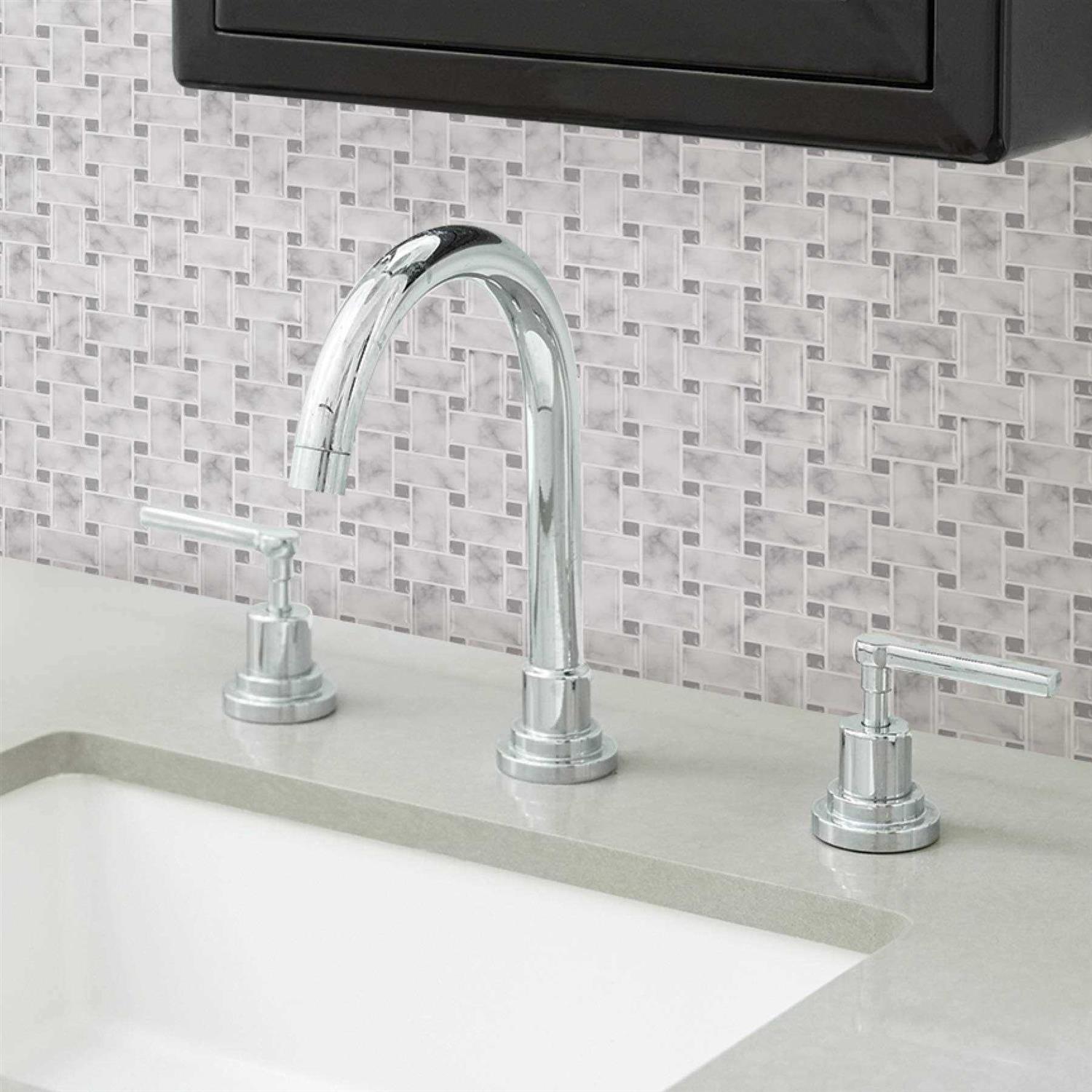 Get the look of white marble that you have always wanted with the ease of peel and stick! Arranged in a beautiful basket weave design, these tile panels have a fresh and clean look perfect for farmhouse bathrooms and kitchens. Basket weave Carrara Peel and Stick Backsplash contains 4 pieces on 4 sheets that measure 10 x 10 inches.