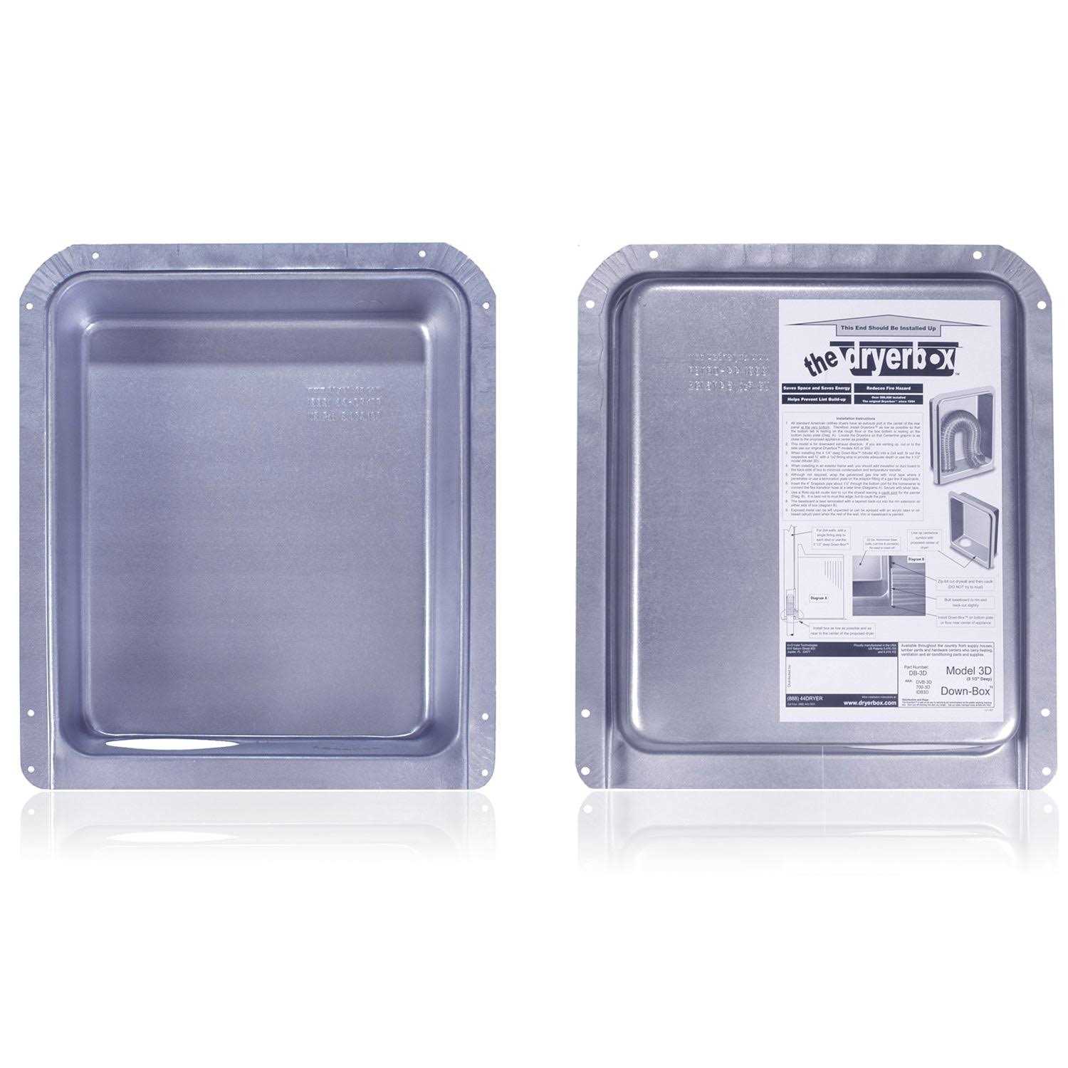 Specification Sheet Installation Sheet Dryerbox DB-3D – 14″ x 16″ In-Wall Dryer Exhaust Receptacle, Downward Exhaust, 2×4 Walls In the past, homeowners had to put up with the inefficient venting of their dryer appliance exhaust due to numerous friction causing bends or kinks in the flex duct hose that connects the dryer to the wall exhaust pipe. Lint build-up and a fire hazard are the unwelcome by-products of these annoying bends. In order to accommodate these flow restrictive bends, the dryer appliance had to be located five to six inches away from the wall, taking away from valuable living area. Choosing the Dryerbox recessed exhaust receptacle makes for a simpler, cleaner install that truly finishes the laundry right. You’ll protect the exhaust hose neatly in the wall, and you’ll be able to place the dryer flush to the wall without crushing the hose or otherwise restricting airflow. Adding this receptacle makes homes roomier and more efficient. It also makes them safer by reducing the fire hazard associated with dryer venting problems. It’s even UL Classified for a 1-hour wall. Give the Dryer Some SpaceToday, you can place the dryer flush to the wall without crushing the exhaust hose or restricting airflow. Install the Dryerbox for safer, roomier and more efficient homes. Protecting flex hose lessens the risk of lint buildup, provides energy savings by removing the kinks usually found in the exhaust hose, and makes for a simpler, more professional looking finish. Features and Beneftis Position the dryer right up against the wall Protects exhaust duct in the wall Elbow eliminator…gain 5 foot of duct run Deep drawn manufacturing in the USA Extension rim extends 7/8″ from nailing flange Eight 1/4″ mounting holes (4 on each side) Surface is paintable Cleaner, more professional finish Lets the dryer perform at peak efficiency Helps protect against fire spread Specifications Overall Dimensions: 19″ H x 16-3/4″ W x 4-3/8″ D Interior Dimensions: 16″ H x 14″ W Wall Framing Size: 2×4 Weight: 4.8 lbs Distance from nailing flange to rear of box is 3-1/2″ Materials: 22 Gauge Aluminized Steel Related Video: The Dryerbox Overview Related Video: Top 5 Reasons to Install the Dryerbox HSS1B10102