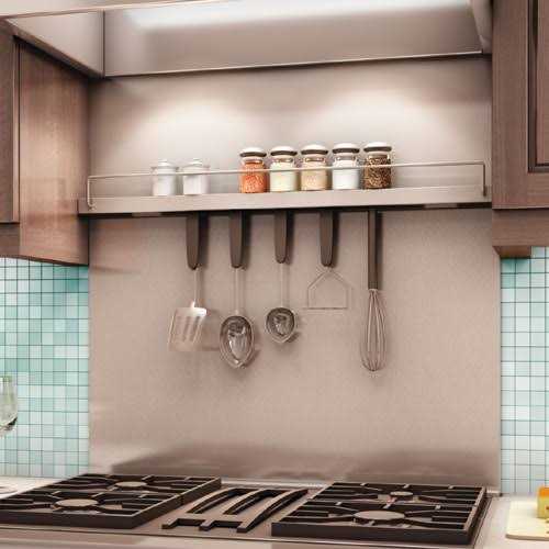 This 30 inch Delta backsplash, made of 304 stainless steel, has sober large utensils and spice racks. The ideal storage solution for your cook range. Height adjustment is possible from 24 inch up to 30 inch which makes it convenient for new-generation slide-in stoves and regular freestanding stoves. Includes molding to close the space behind slide-in stoves.