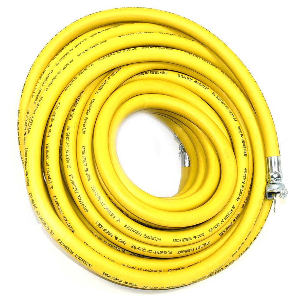 Interstate Pneumatics, HJ59-100E, Jack Hammer Yellow Rubber Hose, 3/4″ x 100 ft, 300 psi This rubber air hose is made from top quality natural rubber compounds which make it highly abrasion resistant. It is tough and durable and made for those who demand high end performance from their air hoses and is ideal for air hammer tool applications on construction sites. This hose comes standard with a 3/4″ Universal Twist lock. These twist lock couplings are secured by hydraulic crimped steel ferrules. Constructed of heavy-duty, reinforced rubber for durability, the hose provides industrial-level performance in all temperatures. It a great product for a wide range of jobsite applications. Features: Resistant to degrading effects of oil, heat and ultraviolet light Flexible, fuel, kink and abrasion resistant for long lasting use Crush proof crimped on hose fittings will withstand the rigors of day-to-day use Equipped with an oil- and abrasion-resistant tube Made of heavy-duty reinforced rubber for durability High-Quality Rubber Construction for Optimum Dependability