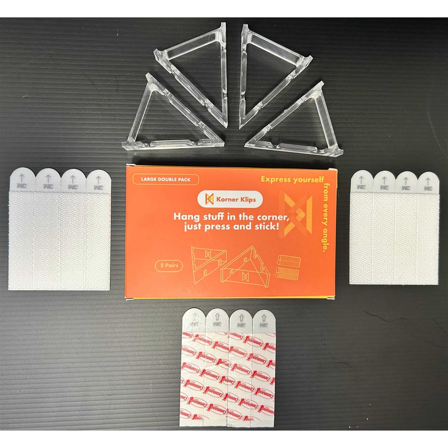 Korner Klips Large Double Pack is a corner hanging system to hang all of your frame, artwork, plants and other home decorating items. It’s easy to use, damage free and holds up to 4 lbs. It comes with 3M double sided tape and Command hanging strips. It contains two complete sets to hang two pieces of art.