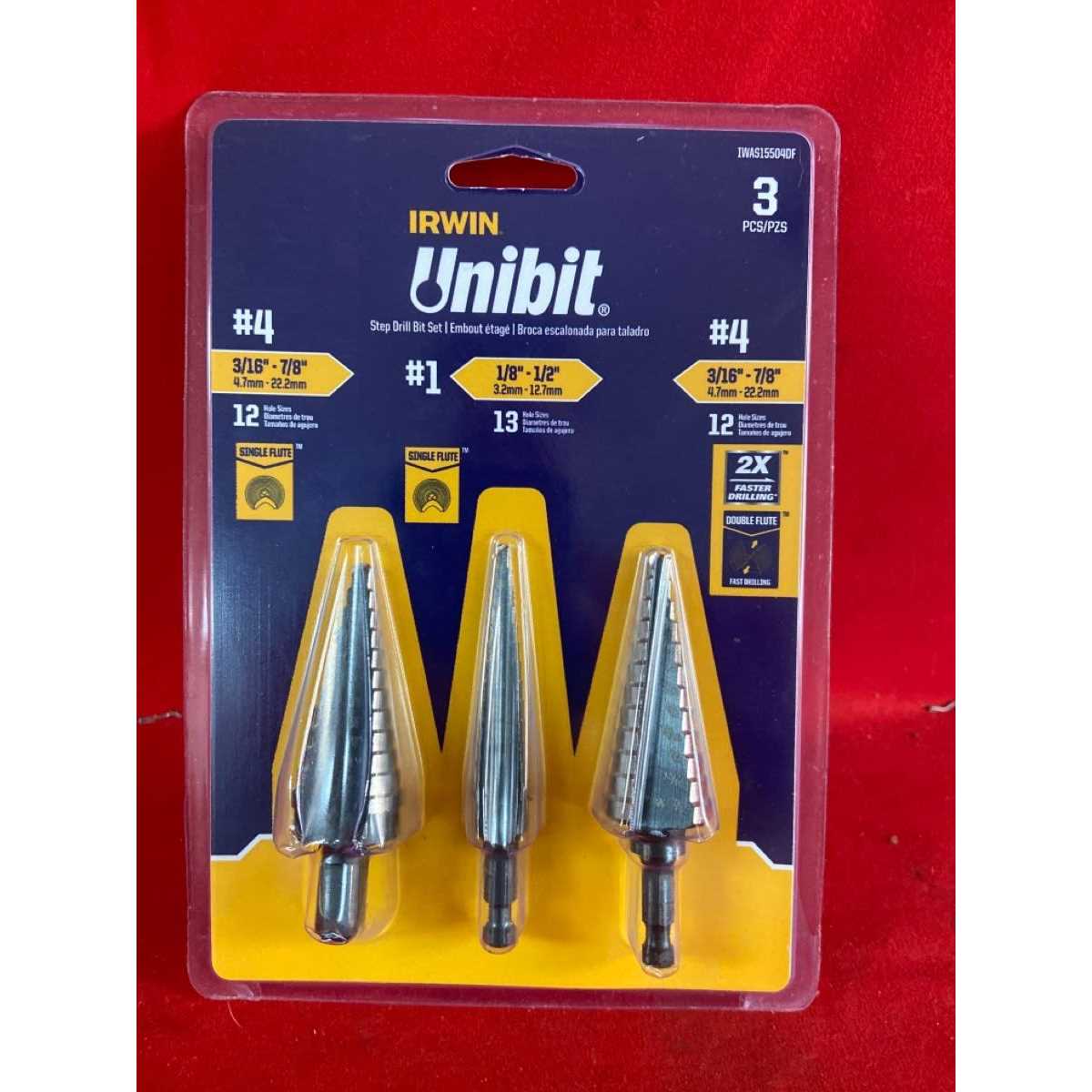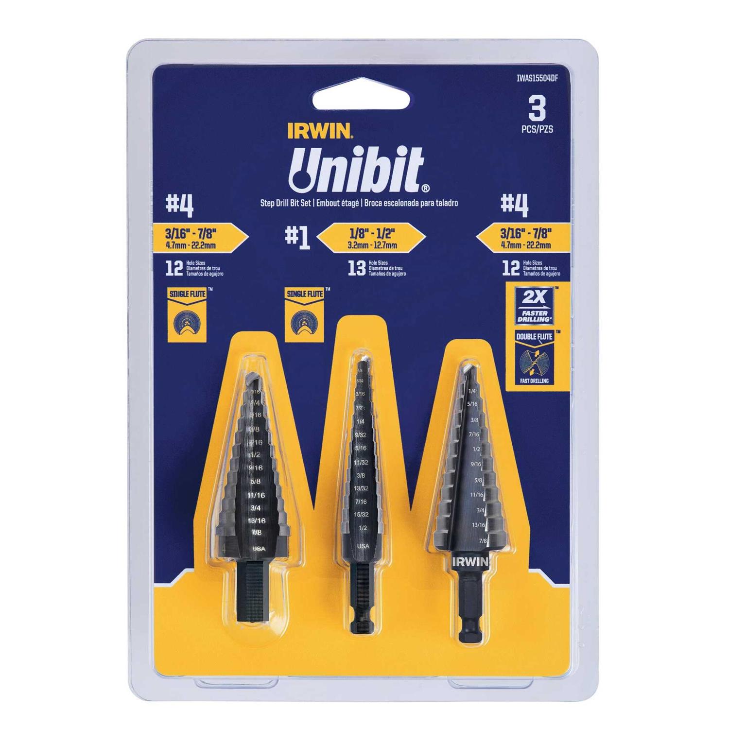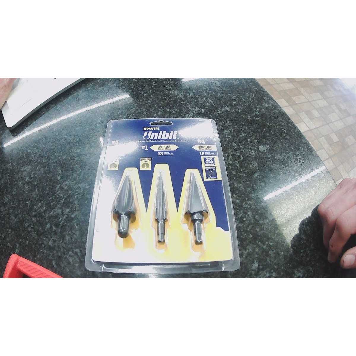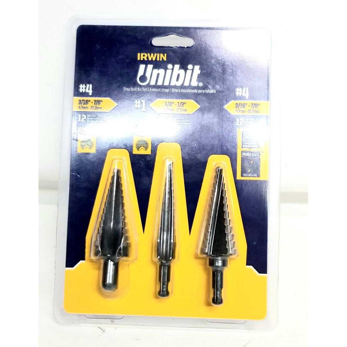 IRWIN Unibit Step Drill Bits are ideal for drilling holes into thin materials such as stainless steel or sheet metal. The 3 piece set includes 2 of the most common Irwin Unibit Step drill bits along with the new double-flute design #4 Unibit that offers 2 times faster drilling.
