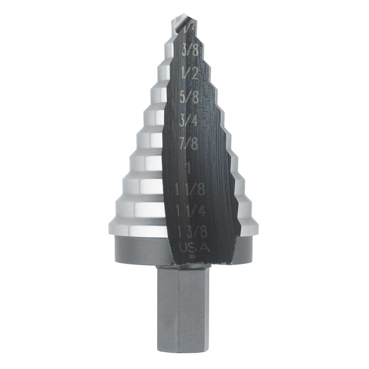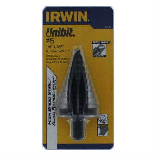 1/4″ – 1-3/8″ #5 Unibit Step Drill By Irwin Tools – High speed steel fractional self-starting 10235 – Single-flute cutting edge for greater control through steps – Hex shank prevents slipping in drill chuck – Also available with (TiN) coating for longer life – New SpeedPoint tip penetrates faster than previous Unibits and prevents walking – Ideal for drilling holes into thin materials such as stainless steel – copper – brass – aluminum – plastic and laminates – Maximum material thickness – 1/8″ – Hole sizes – 1/4″ – 1-3/8″ – Number of holes – 10 steps.