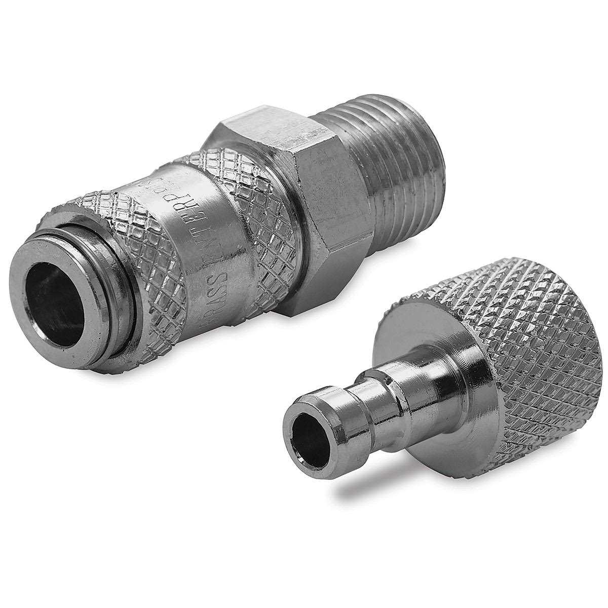 Keep all of your parts up to date! Airbrush Quick Change Adapter & Coupler allows versatile use of multiple airbrushes with one air source and hose. The set completely shuts off airflow when disconnected,screws onto all Iwata air hoses and airbrushes,and is rated for air pressures up to 120 psi. With its quick-release action,changing airbrushes is fast and easy! Package contains 1 airbrush adapter and 1 hose coupler.