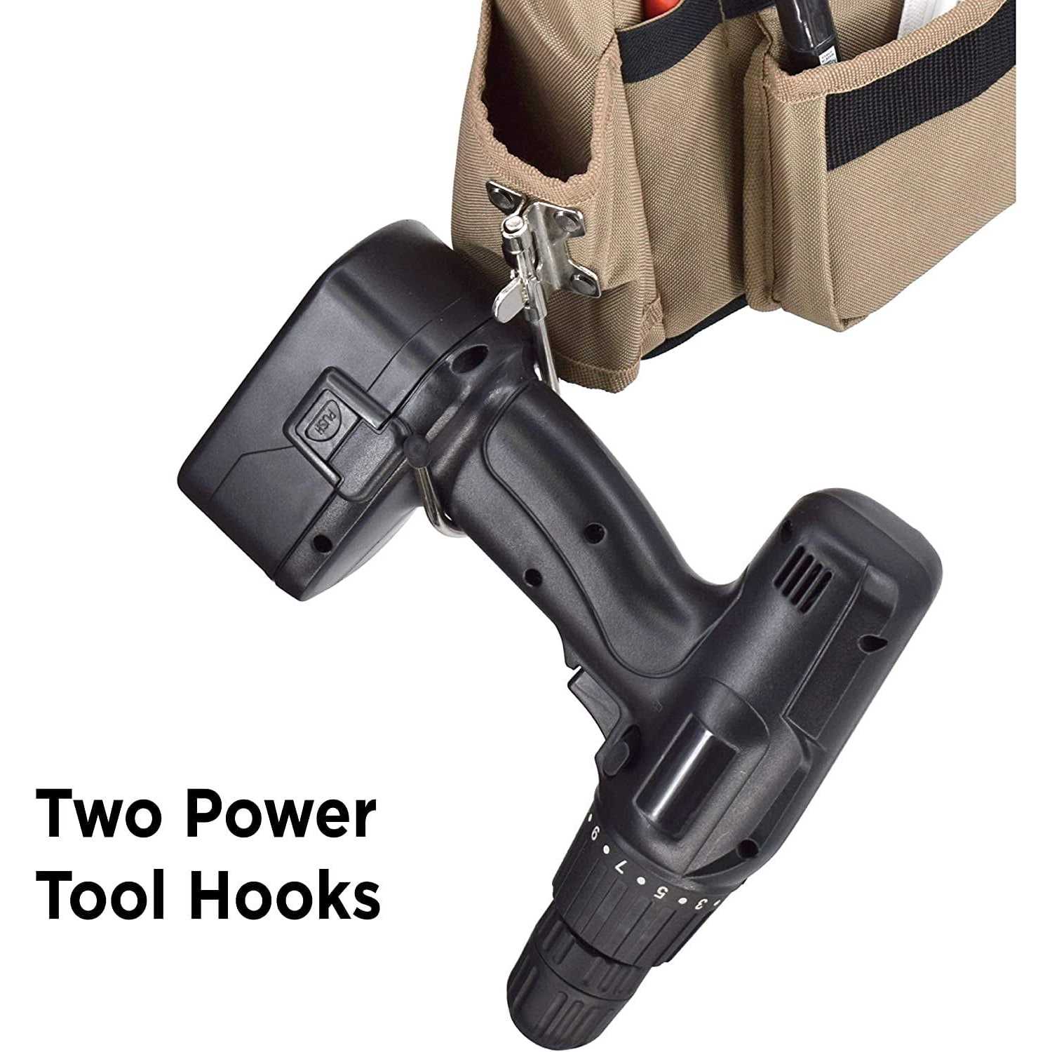 • ORGANIZED: Hammer holder, 2 power tool hooks, and 2 detachable pockets with built-in dividers to keep your tools organized.
