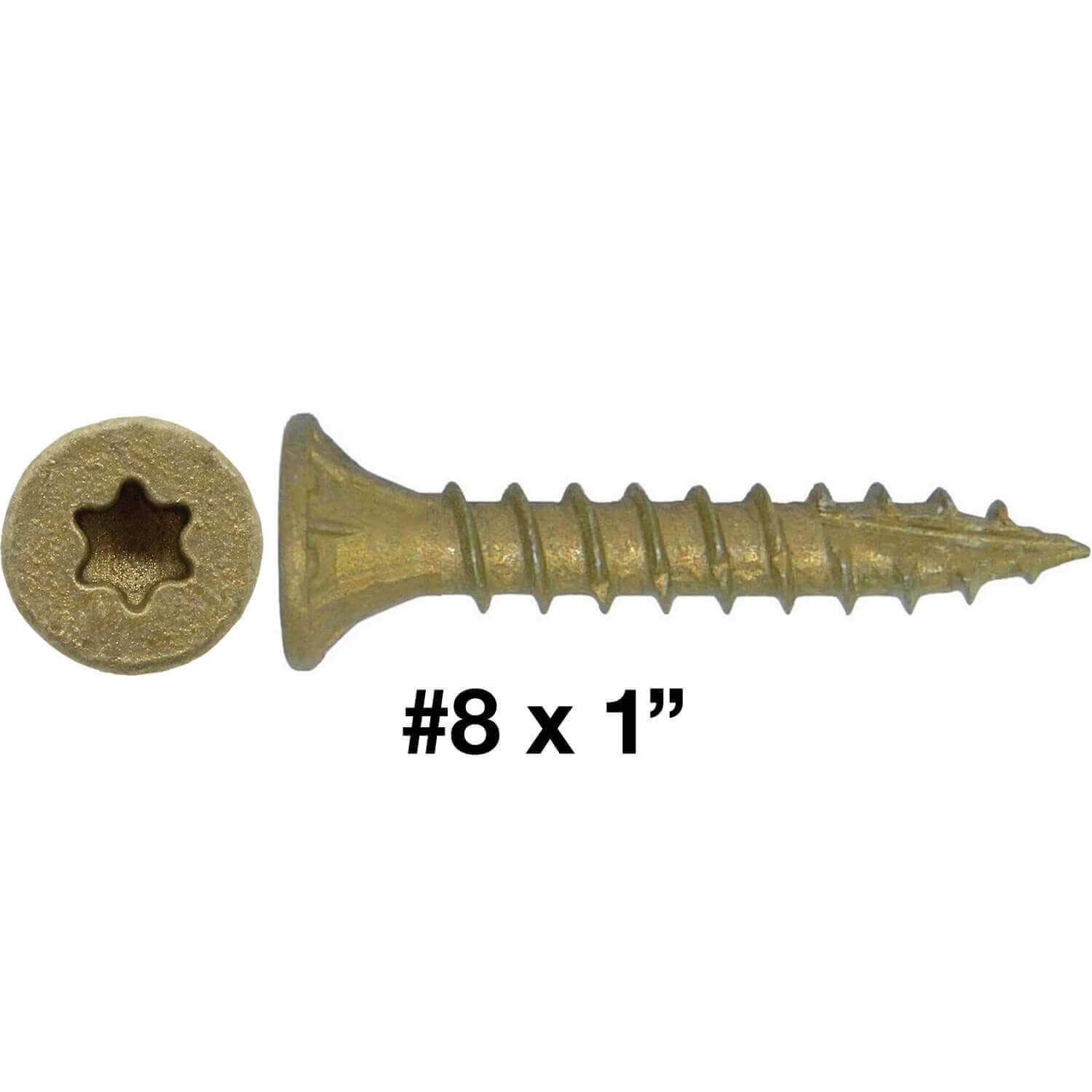 Screw Dimensions – 5/32″ Diameter (#8) -1″ Long (bottom of head to tip) .32″ Width Manufactured from High Quality Heat Treated Steel with ACQ Lumber Compatible coating Corrosion Resistant, Salt Spray Tested over 1200 Hours Without Coating Failure The Type 17 Notched Screw Point Provides Quick Starts without Screw “Walking” Self-Countersinking Nibs for a Clean Installation and Threads Cut Easily Through Tough Materials #8 x 1″ Bronze Star High Performance Wood Screws High Performance Exterior Coated Screws, Excellent Multipurpose Screws For Professional Operations & Demanding Industries, Excellent Screws for Both Hard and Soft Wood Manufactured from High Quality Heat Treated Steel with Triple Ceramic Coating Corrosion Resistant, Salt Spray Tested over 1200 Hours Without Failure ACQ Compatible with Treated Lumber, Outstanding Abrasion Resistant Deep, Wide, Sharp Screw Threads Provide Maximum Holding Power High Quality Screw Threads Cut Cleanly & Easily Through Tough Materials Type 17 Notched Screw Point for Quick Starts without “Walking” Torx/Star Drive Delivers Twice the Torque of Phillips or Square Drive Screws Deep Torx/Star Drive Screws Reduce “Cam-out” Excellent Screw for Cabinetry, Furniture, Roofing, Framing, etc. This product includes 1 Pound of the #8 x 1″ Bronze Star BTX Wood Screws Bronze Star High Performance Multipurpose Torx/Star Drive Wood Screws “BTX”, #8 Diameter by 1″ Long. Use T20 Torx/Star Drive Bit for Installing these Quality Wood Screws. Bulk Quality Wood Screws for the Best Possible Value. Our Bronze Star Torx/Star Drive Screws are an Excellent Fastener for Multipurpose Applications in Hard and Soft Woods, Chipboard, and other Tough Materials. Uses include, cabinetry, framing, furniture and many more. Our Wood Screws are so Strong they can even be Removed and Reused. This 1 Pound quantity of our high performance exterior coated wood screws has approximately 288 screws. Torx/Star Drive Wood Screw Head Provides Twice the Torque of Phillips or Square Drive Screw Heads Screw Engineering Specs: Average Shear Strength of #8 Shank —- 2213 lbs Average Pull-Out Strength —————- 363 lbs (Screw Pull Out is Calculated with a 2″ Length Screw in the wood species: Yellow Pine Wood)