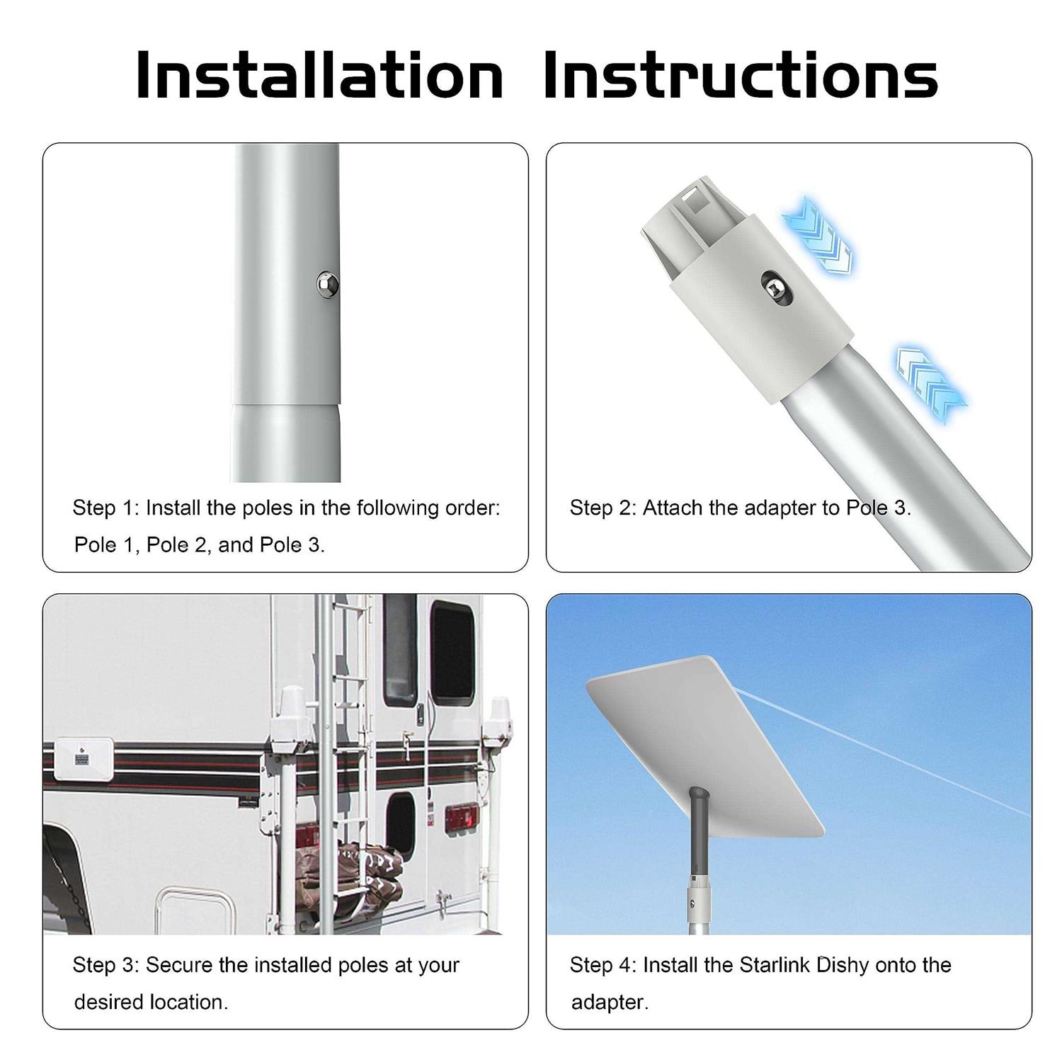 Improved Signal Reception: Achieve faster transmission speeds with a higher positioning that provides a broader signal reception environment. Premium Aluminum Alloy: Built to last, our mount kit is constructed with high-quality aluminum alloy known for its strength and durability. Easy Assembly: Simply connect the poles and securely fasten them to your desired location. Quick and stable installation made easy. Wind-resistant and Rust-proof: The 2-inch diameter aluminum pipes withstand strong winds while offering excellent rust resistance. Sturdy and Reliable: Enjoy peace of mind knowing that your Dishy is securely mounted with this robust and dependable mount kit. Jangker Starlink Mounting Kit /b br/ Specifications /b br/ Package SIZE: 35.5 * 4.2 * 4.2 in. br/ MATERIAL: Aluminum Alloy br/ Weight: 3.5 lb br/ Package included /b br/ 1 x 8ft Starlink Pole Mount br/ 1 x Starlink Pipe Adapter br/ 1 x Installation Guide br/ br/ br/ Note /b br/ RV flag pole kit ladder mount is not included br/ Not For Vehicles In Motion br/ br/ br/