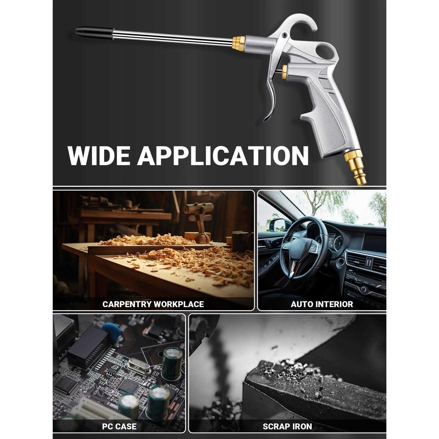 JASTIND Air Blow Gun Heavy Duty Air Nozzle Blow Gun, Air Gun for Compressor with Extended Nozzle, Pneumatic Air Compressor Accessories Tool for Car Detailing / Industrial Household Cleaning Metal Spindle Rod The air blow gun tool is well made of a steel trigger to ensure the trigger is constant. The sealed valve using metal spindle rod, copper spool and stainless steel spring, anti-aging, can be durable, the use of silicone seals to prevent air leakage, selected accessories, only for better air compressor gun. Extended Nozzle with Protective Tip This air compressor nozzle blow gun adopts 6.4 inches extended nozzle with rubber tip, strongly concentrates the air which makes it more effective, easy to reach into tight place and make sure the safety of delicate or sensitive areas. Standard 1/4″ Quick Connector This blow gun air tool adopts universal 1/4” NPT inlet thread to connect the air hose line. Docking easy and fast with common industrial and household air compressors. Comfortable Grip & Convenient Hooks Handle is designed with excellent pistol grip for an ergonomic feel and easy to squeeze the trigger. Comes with double hanging hooks facilitate your placement and storage. JASTIND air compressor blower gun with high volume air flow is ideal for carpentry workplace and industrial workshop dust, powders, debris, or sawdust blow off.