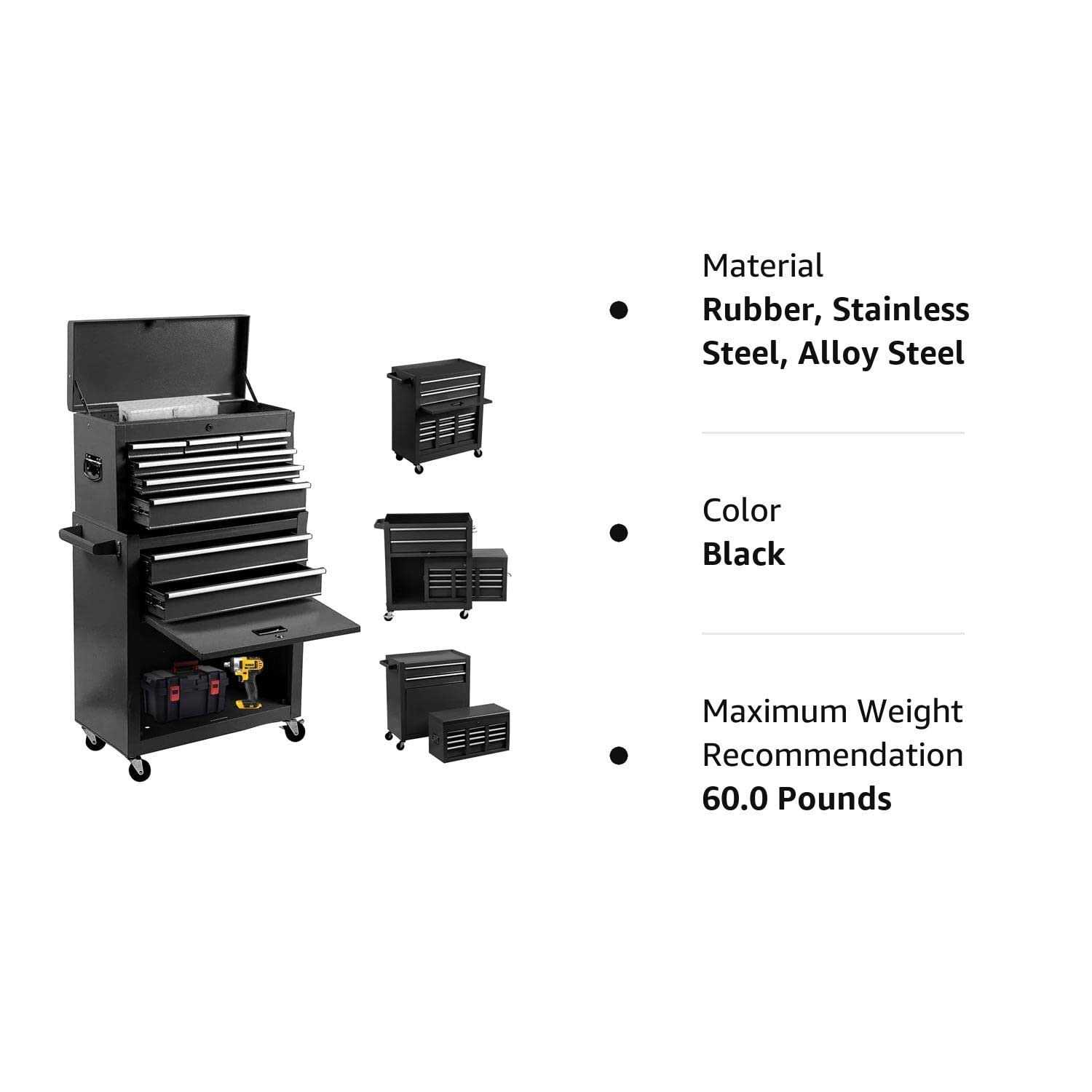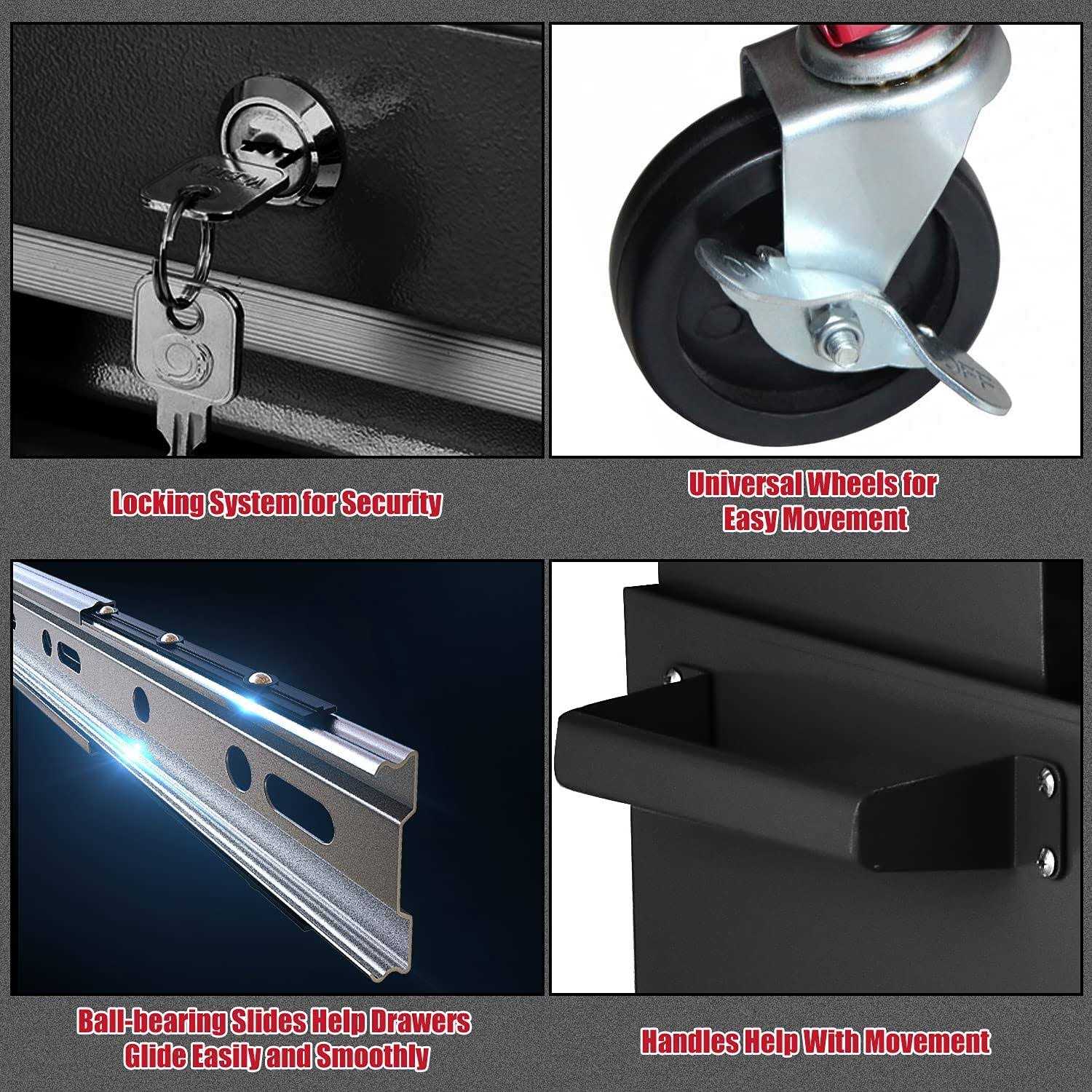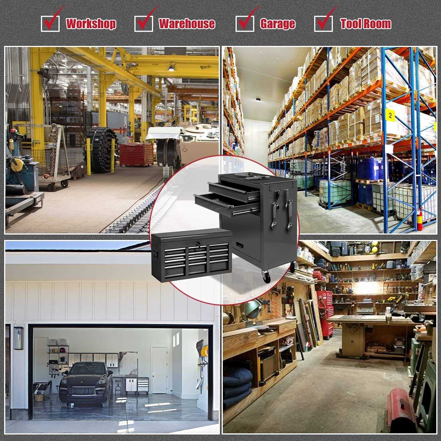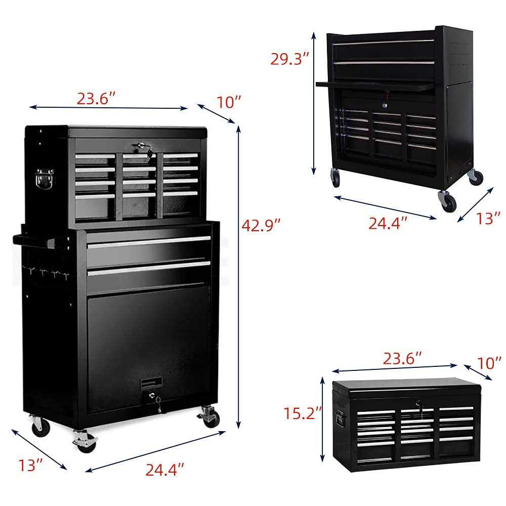 【BEST COMPANION】: Our tool chest consists of a top toolbox and a bottom tool cabinet. The tool cabinet at the bottom has a push hand and the toolbox at the top has a handle. The tool cabinet at the bottom has 4 rubber wheels so you can push it anywhere without making any noise. It’s very portable. With it, you’ll be everywhere you go with your tools. It also keeps your tools in good order. Believe me, this tool chest will be your best companion during the working day. 【LOCKABLE & SAFE】: Our tool chest is lockable.You can keep your tools locked inside when you are not near it to keep them safe.Each tool is very important to the tool user. With a lock, you will never have to worry about losing your tools, so you can focus on your work. 【 LARGE STORAGE】: The tool chest has 8 drawers that make it easy for you to store different tools and use them at your fingertips. The tool cabinet at the bottom has a lot of space and you can put a lot of things in it. The two-in-one design is portable and can store a lot of things at the same time. 【 HIGH QUALITY MATERIAL】:The tool chest is made of high quality cold rolled steel with a coating of paint to prevent rust, which makes the tool chest sturdy and durable. Rubber wheels make it move quietly and smoothly. 【VERSATILE USA】: Our tool chest can be used in many different places, such as the workshop, the factory, the storage room, the maintenance room. You can take it with you whenever you need to use a tool. Of course, you can also use it to place other items if you want.”