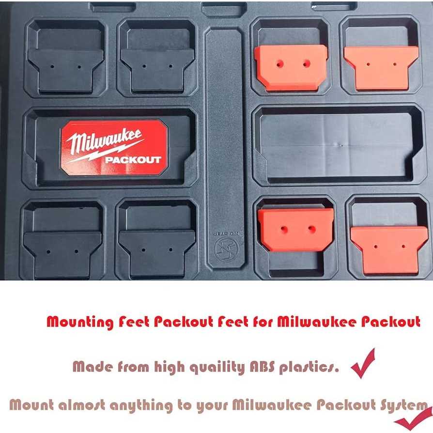 Power Tools Replacement Parts by JILINWEI. Details:JILINWEI Mounting Feet for Milwaukee Packout Light friction holds feet securely in slot. Just simply screw/bolt the ‘feet’ to the base of the box, vacuum, panel etc and you’re ready to attach it to your Milwaukee Packout cases. Made from high quaility ABS plastics.