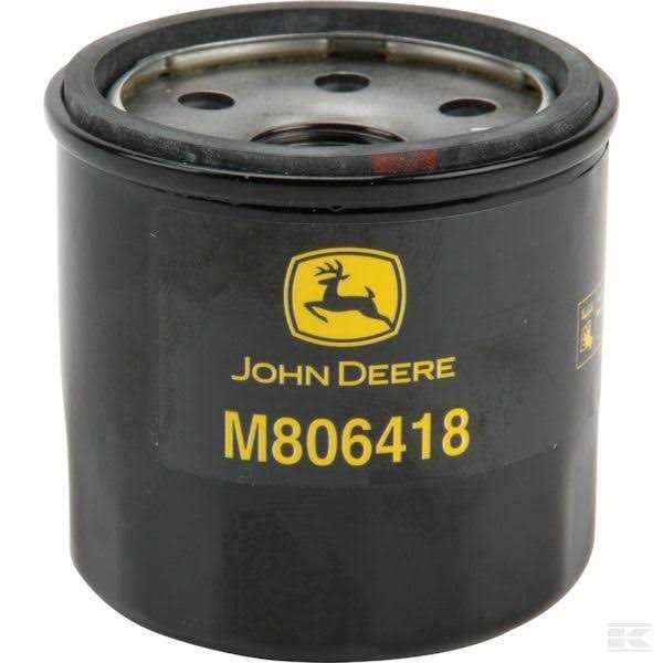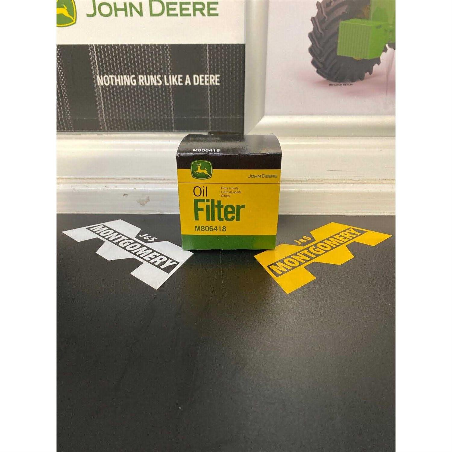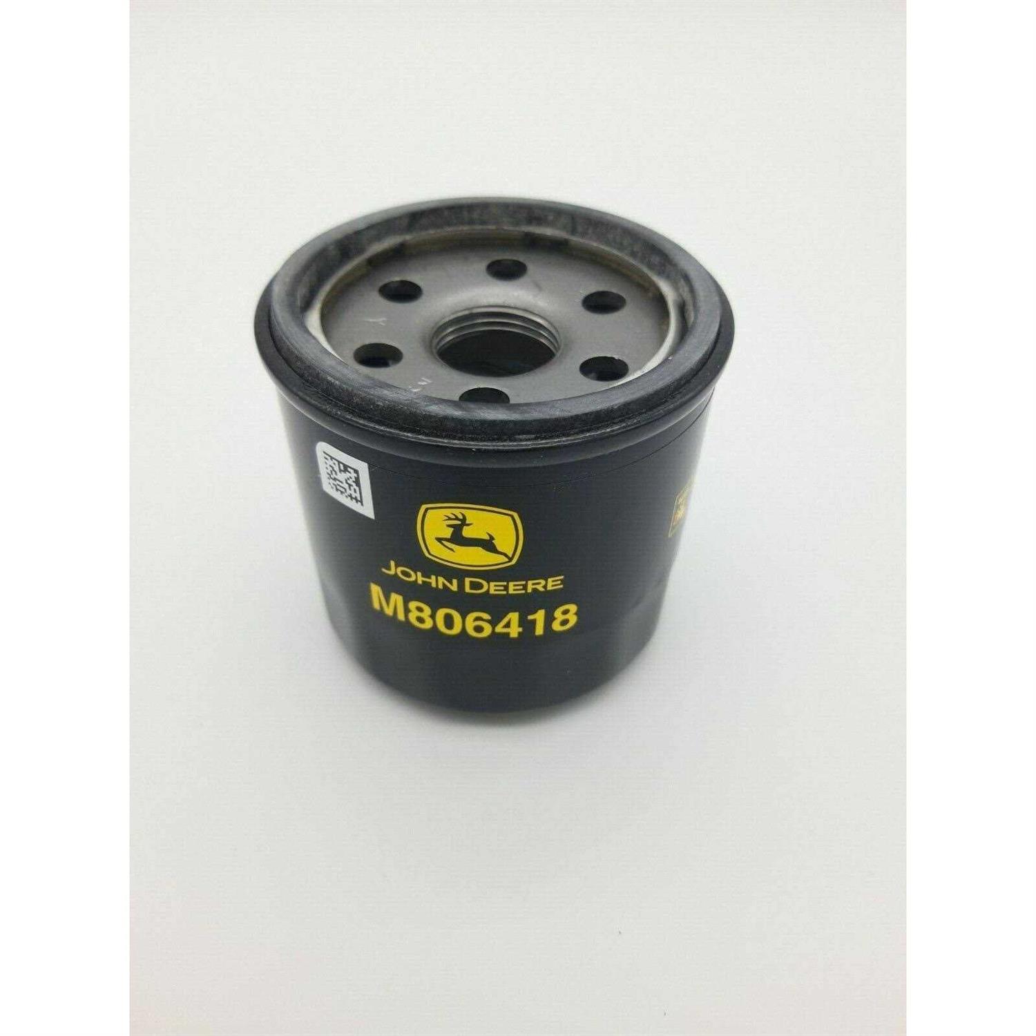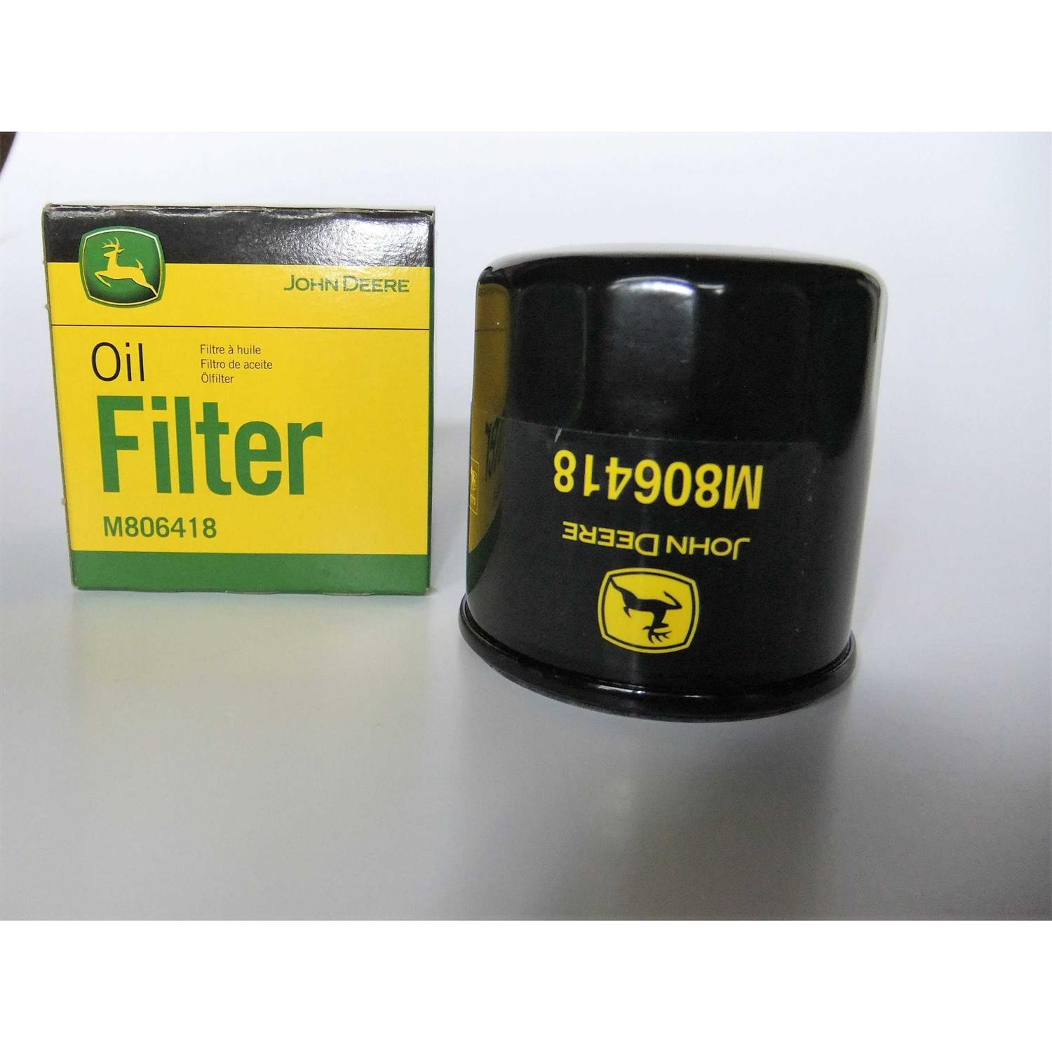 A genuine John Deere #M806418 oil filter. John Deere oil, transaxle, and hydraulic filters contain large inlet holes, more media paper, and rubber seals that provides a consistent flow, greater filtering of harmful particles, and no internal leakage insuring long engine life. Recommended to change on a regular basis.
