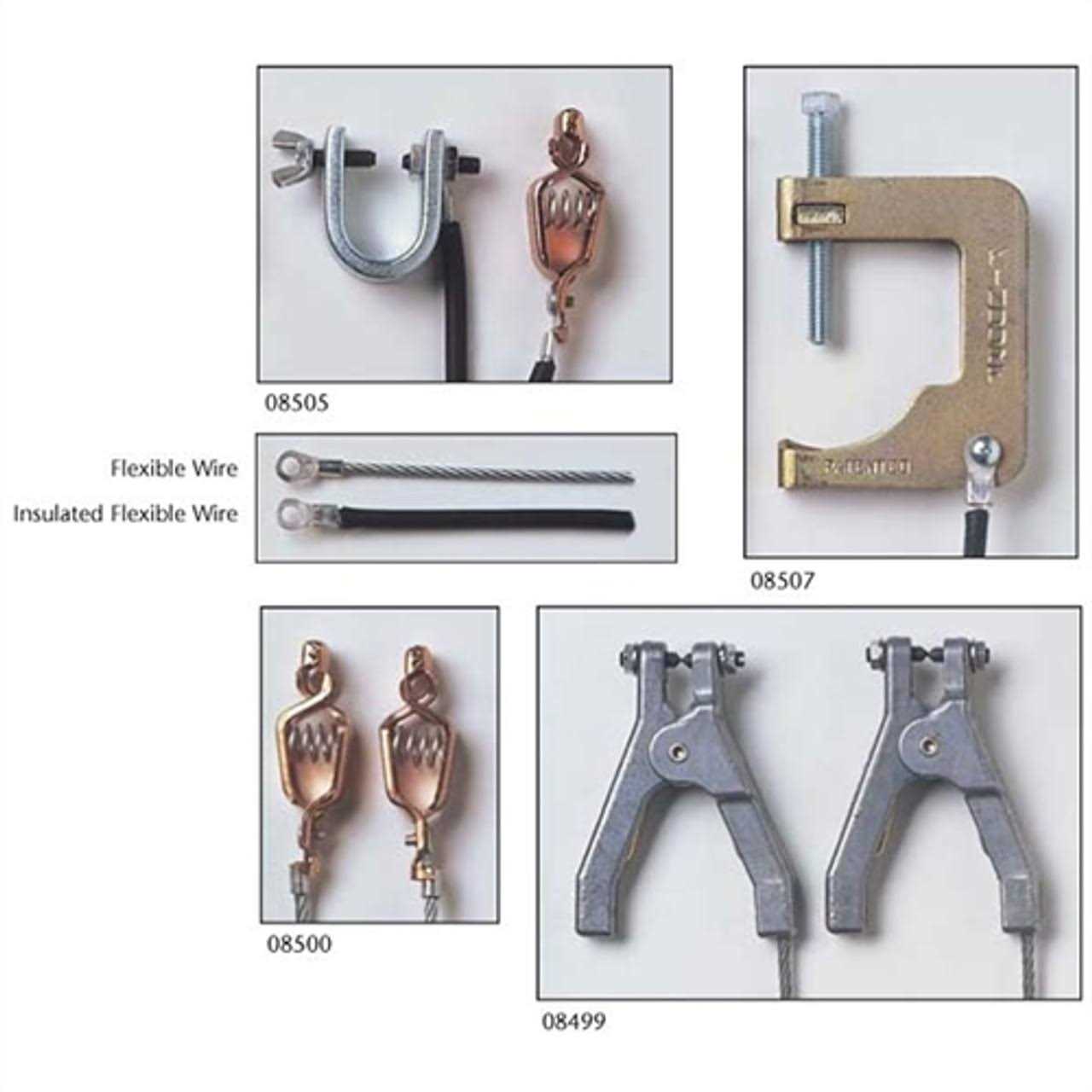 This alligator clip can be used with antistatic grounding wires. Antistatic wires prevent sparks and reduce fire risks from static electricity generated by the movement and flow of flammable liquids. During waste collection operations, use one antistatic wire to bond from a safety container to a receiving vessel such as a funnel, then correctly ground by attaching a second antistatic wire to the drum and then to an earth ground. Available with various end connections and either insulated or non-insulated flexible wire. Standard wire lengths are 3′ and 10′; for more extended reach, use several wires with 1/4″ terminal ends.