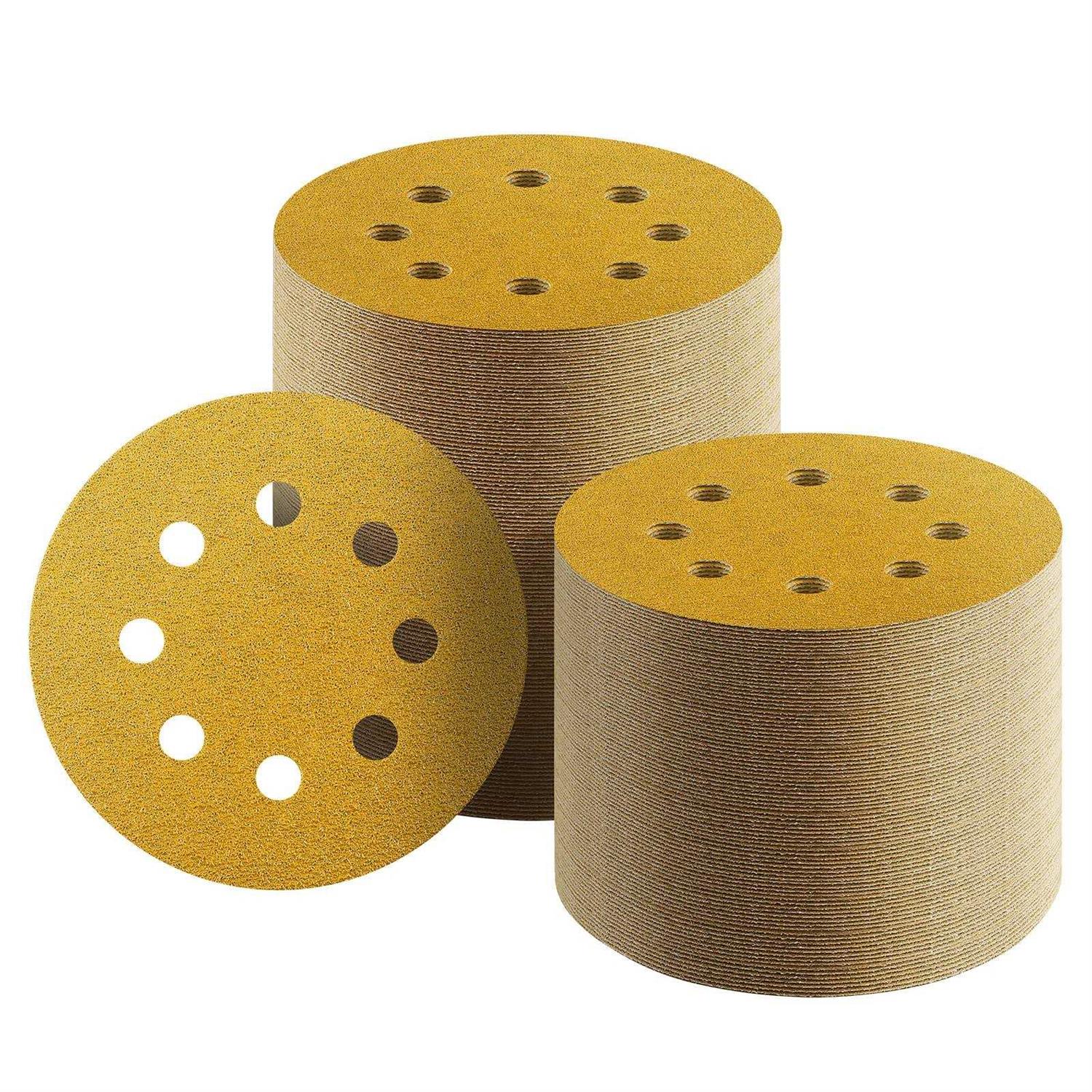 Keeimp 100 Pcs 5-Inch 8-Hole Hook and Loop Sanding Discs, 60/80/120/220/320 Assorted Grits Gold Sandpaper for Woodworking or Automotive 5 inch