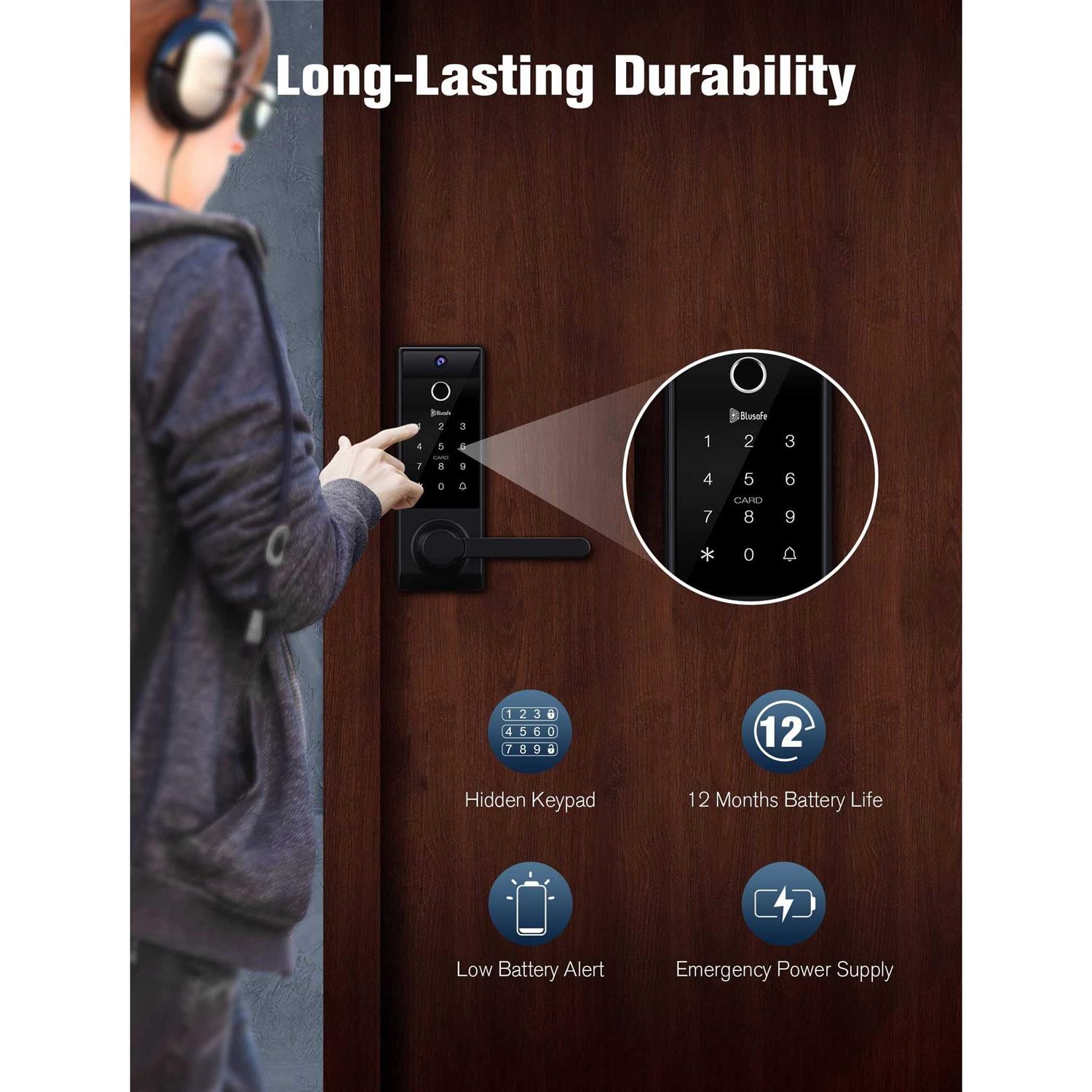 [Superior Sturdiness & Security] Made of solid zinc alloy material, the Blusafe smart lock ensures the highest quality and durability to prevent any possibility of forced unlocking. An alarm can be triggered to scare away suspicious people when being forced to unlock or attacked. The smart lock locks automatically when the door is closed, no need for manual operation or setting. With no risk of invasion, enjoy your peace of mind even if you are not at home. [Remote Control with Doorbell Camera] The smart door lock will take a photo and send a notification to your phone immediately when someone rings the doorbell. You can send a one-time password or slide to unlock the door in the App. Note 1 the remote unlock function is passively triggered by ringing the doorbell on the smart lock, 2 the camera has no video calling or recording functions, 3 incompatible with smart homes such as Alexa and Google Assistant [Bank-Level Secure Biometric Fingerprint Sensor] Adopting an advanced 3D biometric-based fingerprint sensor, the Blusafe fingerprint door lock ensures bank-level security for your home. Unlike optical fingerprints, the fingerprint door lock accurately identifies your fingerprint within 0.5s, with a resolution of up to 508dpi, avoiding unlocking by copied fingerprints. With a capacity of up to 100 fingerprints, you can easily share with your family, friends, dog walkers, housekeepers, etc. [Long Run Time & Emergency Charge] Designed with a hidden touch keypad, the WiFi smart door lock has a lower consumption, and the required 8 AA batteries (not included) can provide at least 6 months of operation. A low-power voice prompt will be activated when the battery is below 20%. When out of power, the WiFi smart door lock remains locked and supports emergency power supply via USB port. *Run time depends on the frequency of use and the quality of the battery. [Easy Setup for Right & Left Door] The keyless entry door lock with handle fits both right & left-handed doors, and can be easily installed with the screwdriver, without hiring an expensive installer. The keyless entry door lock with handle fits most standard residential doors with thicknesses from 1-2/5″ to 2-1/8″ (35 and 54mm), backset: 2-3/8″ or 2-3/4″ (60mm or 70 mm). The Doorbell Camera refers to unlocking or locking through electronic devices such as smartphones. Convenience is evident, security measures are also a concern that has drawn a lot of attention. The Blusafe fingerprint door lock combines security and performance, making it an ideal choice for your front door. Superior Sturdy & Security: Made of solid zinc alloy material, the Blusafe smart fingerprint door lock ensures the highest quality and durability to prevent any possibility of forced unlocking. Bank-Level Secure Biometric Fingerprint Sensor: Adopting an advanced 3D biometric-based fingerprint sensor, the Blusafe biometric door lock ensures bank-level security for your home. Fast Recognition: The biometric door lock accurately identifies your fingerprint within 0.5s, with a resolution of up to 508dpi, preventing it from being unlocked by copied fingerprints. Remote Control with Photo Captured: When someone rings your doorbell camera, the doorbell camera will take a photo and send a notification to your phone immediately. You can know who is outside the door anytime, anywhere, and easily unlock/lock with just one click or share a one-time/duration passcode with your visitors such as couriers, housekeepers, and gardeners. Long Run Time: Designed with a hidden touch keypad, the keyless entry door lock with handle has lower consumption, and the required 8 AA batteries (not included) can provide at least 6 months of run time. Emergency Charging: When out of power, the keyless entry door lock with handle remains locked and supports emergency power supply via a USB port. Package Contents: Internal Panel*1 Mounting Plate*1 External Panel*1 A – ST 3.9 x 20mm Self-tapping Screw*4 B1 – M4 x 35mm Screw*4 B2 – M4 x 50mm Screw*4 C – Screw Pillar*1 D – ST 3.9 x 16mm Self-tapping Screw*1 H – M4 x 10mm Screw*4 E – Screwdriver*1 F – Key*3 G – Keycard*2 Strike Plate*1 Strike Box*1 Adjustable Latch*1