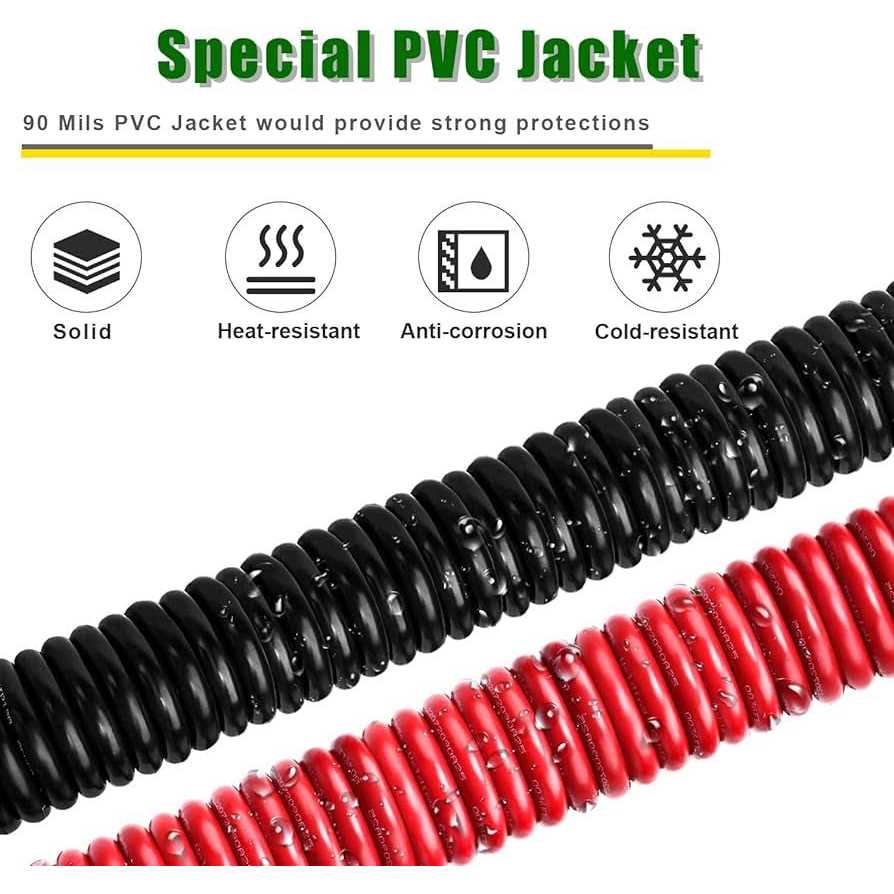 Made of 99% pure copper (OFC) that improve electrical conductivity, weldability, corrosion resistance Sheathed by high quality PVC jacket which effectively prevent cable oxidation, corrosion, high temperature resistance, gasoline, battery acid and abrasion Built by high strands of 0.254mm copper wire twisted together to improved conductivity and with 90 mil PVC jacket make it more flexible Working temperature is between -40-105°C, operating voltage rate up to 600V(AC) Our products are large-sized wires and use in high power appliciations: Welding, Battery, Car amplifier, Solar systems, Winch, Generator etc. 1