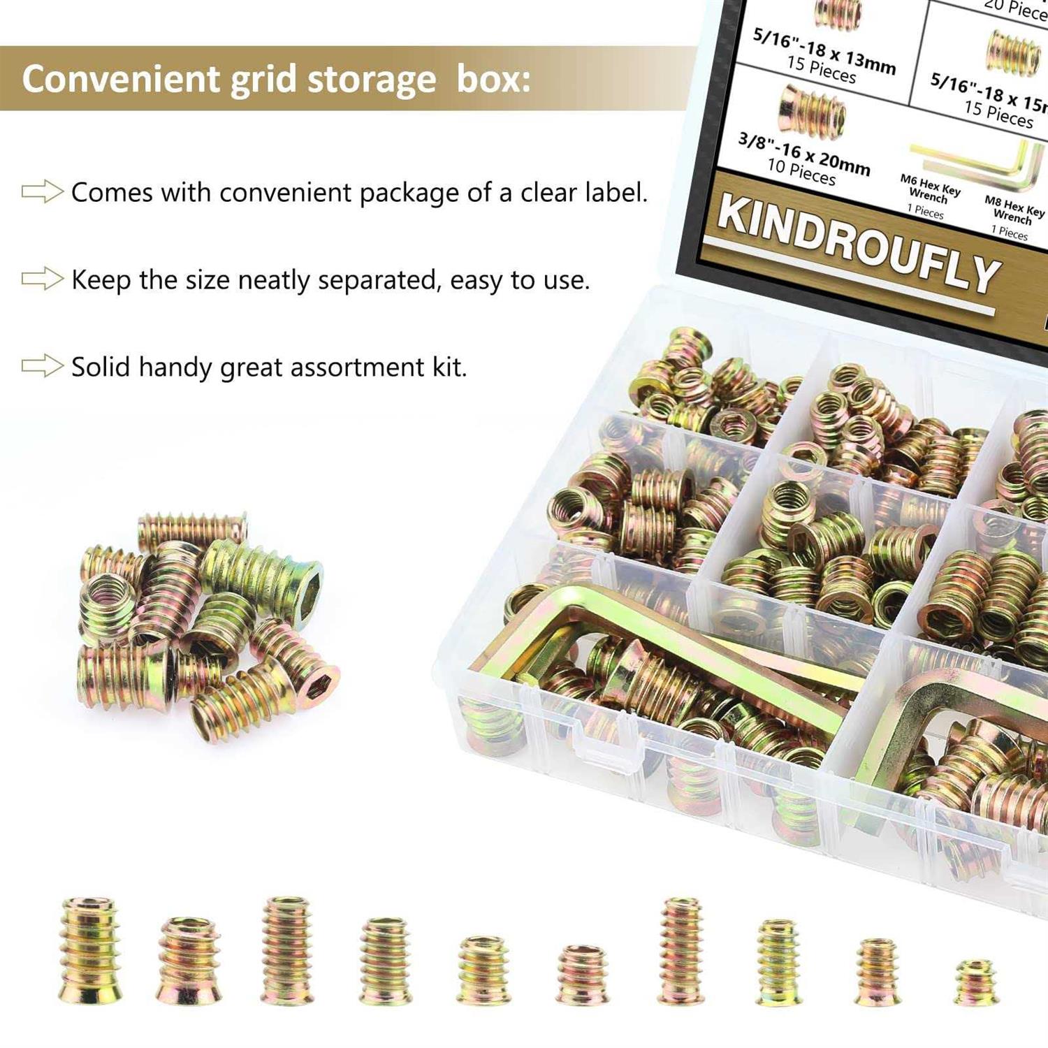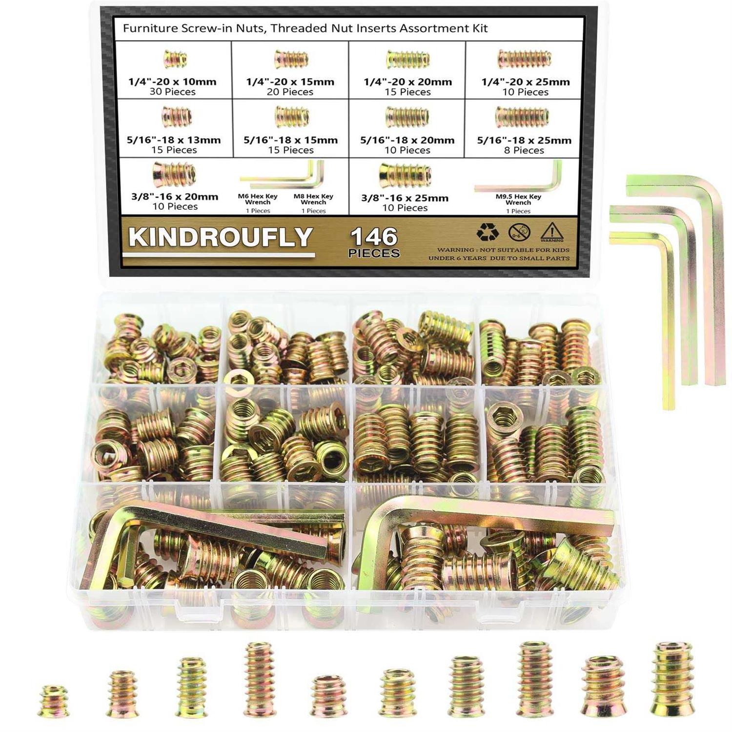 Kindroufly 146 Pieces 1/4″-20, 5/16″-18, 3/8″-16 Threaded Inserts, Nut Inserts, Wood Inserts, Steel Threaded Inserts Assortment Kit for Wood