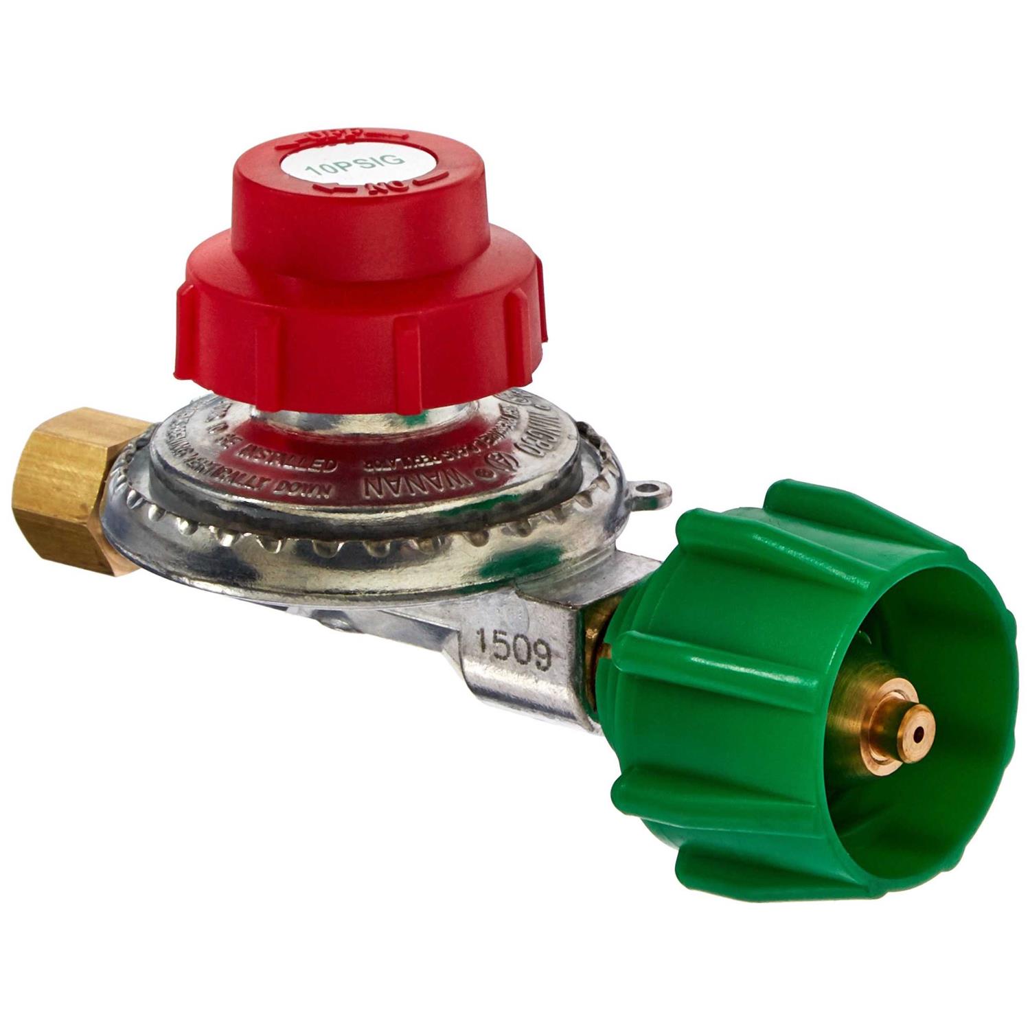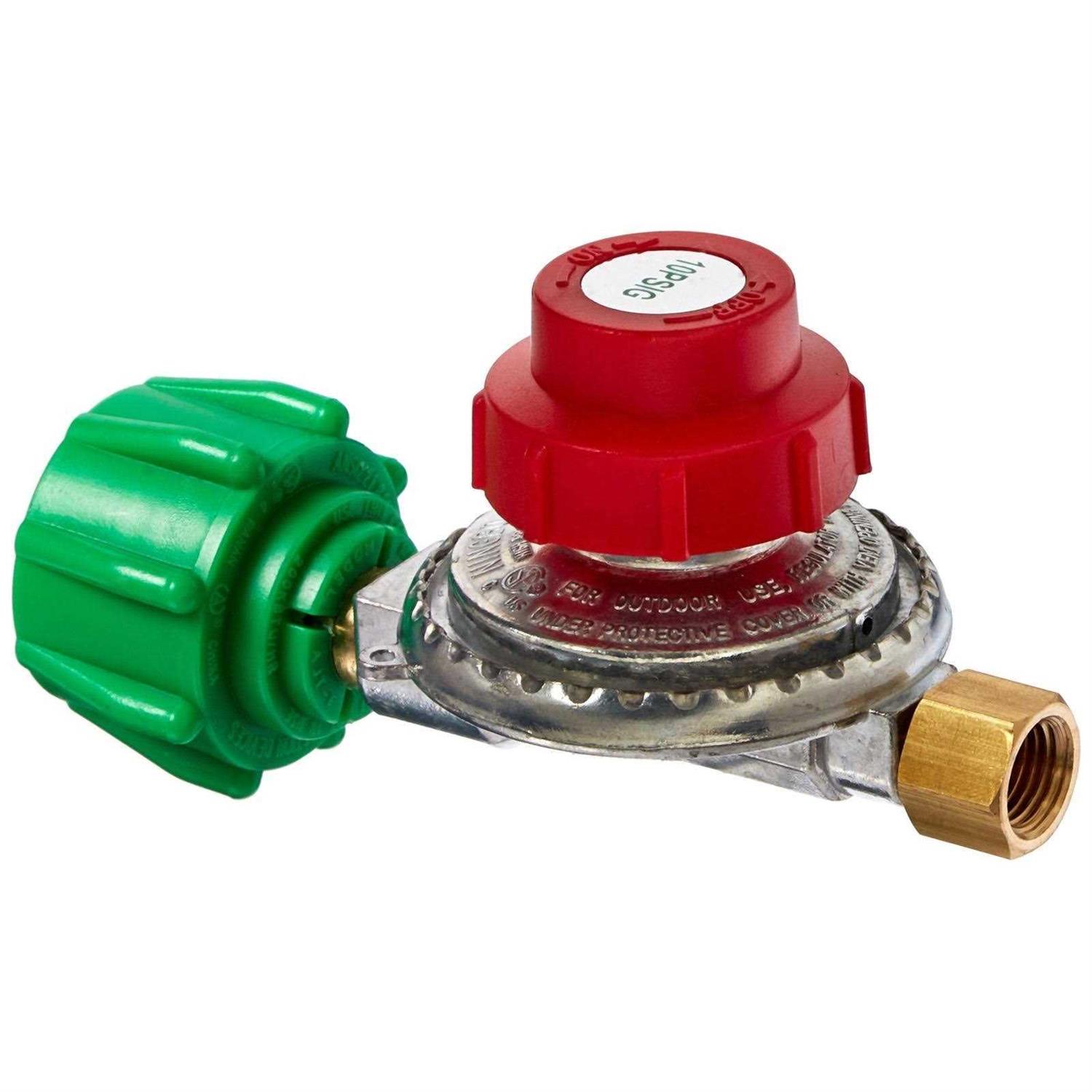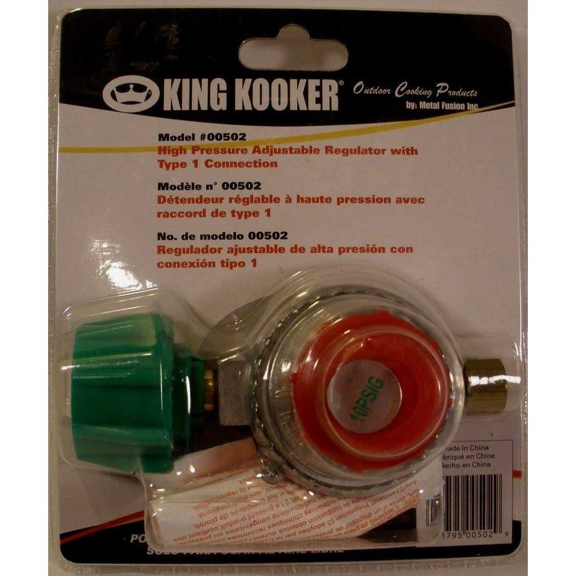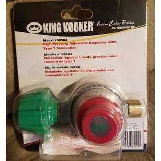 King Kooker high pressure regulator with type 1 connection, pre-set for maximum 10 P.S.I. outlet. It is designed for use with outdoor appliances such as torches, jet burners, etc., that require pounds of pressure as opposed to Water Column inches. Check your product and its instruction manual for the proper replacement parts before attaching this regulator to any L.P. gas product.