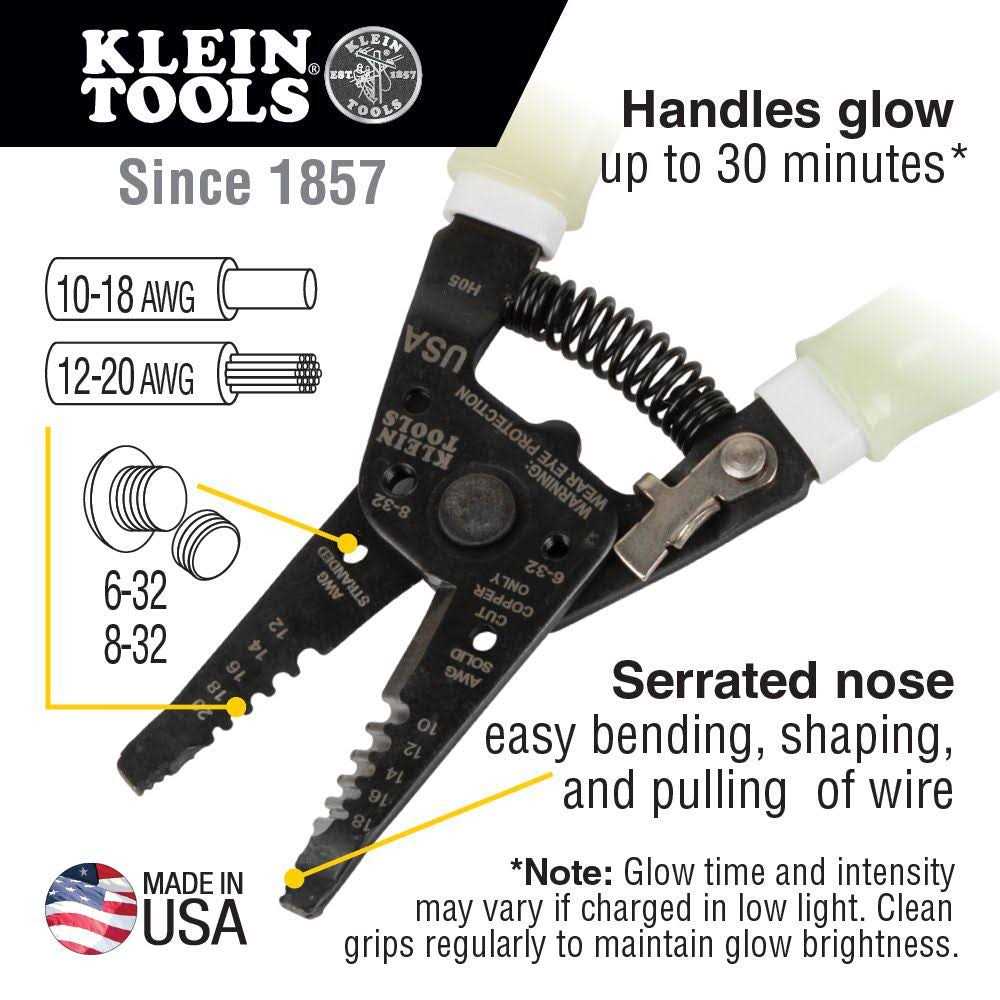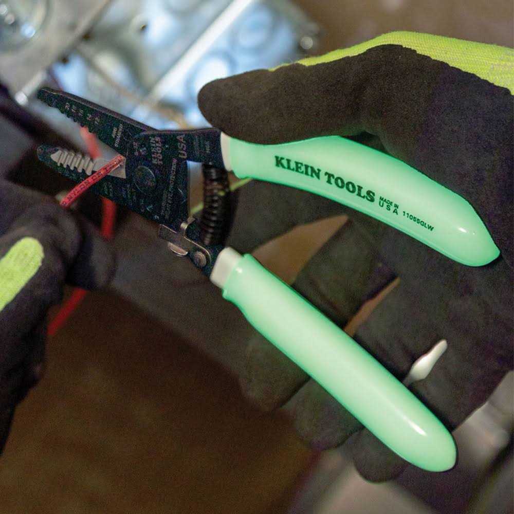 Klein Tools’ High-Visibility Wire Stripper / Cutter allows you to find your tools in the dark. The glow-in-the-dark grips can stay illuminated for up to 30 minutes. Plus, they charge in natural or artificial lighting. This Wire Stripper and Wire Cutter tool cuts, strips, and loops 10-18 AWG Solid and 12-20 AWG Stranded wire.