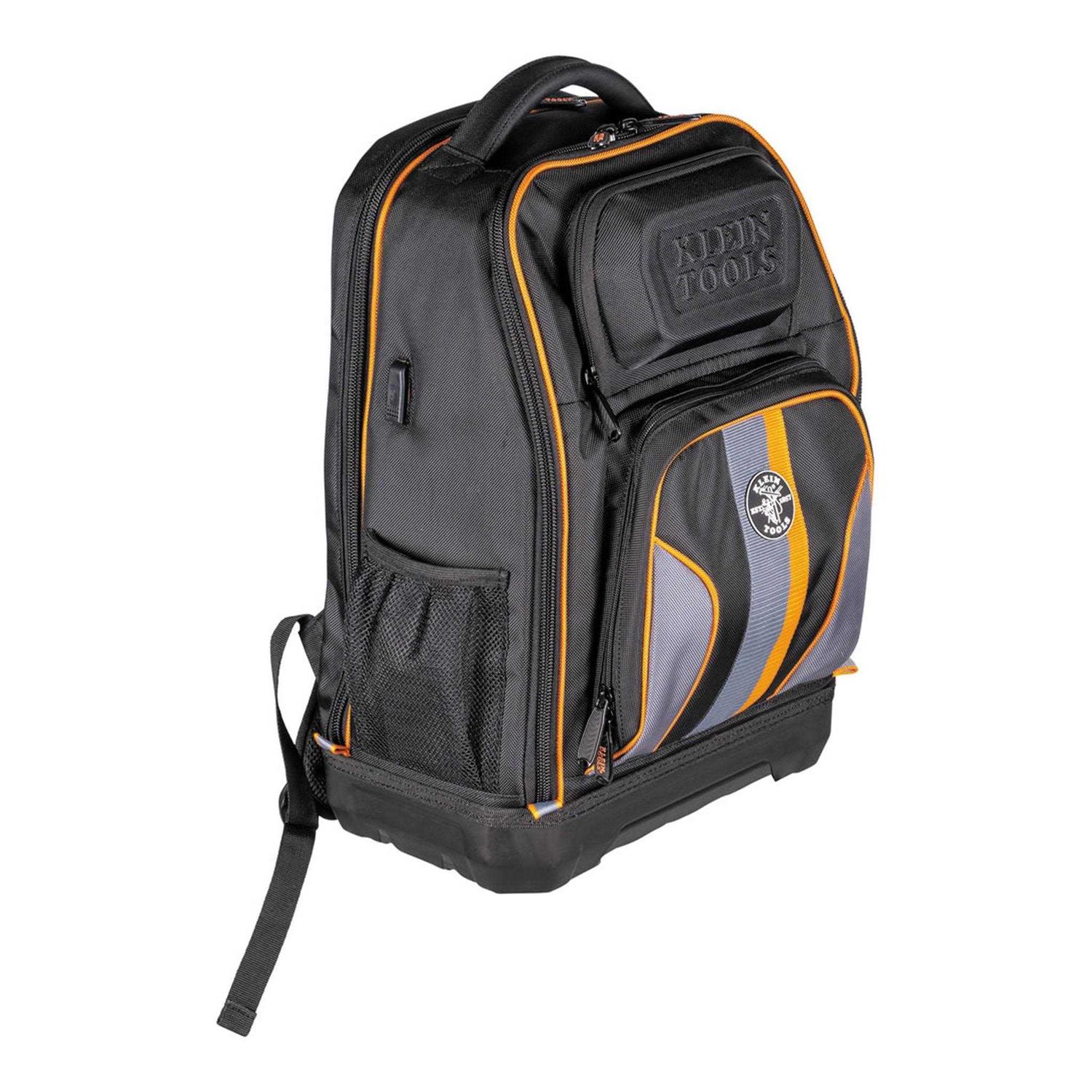 Klein Tools’ Tradesman Pro XL Tech Backpack is a seriously tough backpack specially designed to keep your devices protected and carry the essentials you need to get you through your day. This backpack has two main compartments; the front for tools and meters and the back has a protective padded pocket for laptops and tablets up to 17.3-Inch (screen size diagonal) wide and up to 1.5-Inch high. The innovative curved, fully-molded hard bottom design provides maximum comfort while keeping your devices and tools safe from the elements. The front pocket of the backpack allows for easy access to frequently used small tools or devices, while the large interior has soft neoprene pockets for meters and a netted pocket for cords and cables. The USB-C cord and exterior port make it easy to charge your devices at any jobsite. Tech Backpack with two main compartments: one designed for tools and meters at the front, and another at the back for laptops or tablets. 28-Pocket Tool Bag Backpack to keep tools, meters and other tech devices organized and safe. Curved, fully-molded bottom is comfortable to wear and helps protect contents from the elements. 1.5-Foot USB-C cord is included with a cord management system. Exterior port for charging devices outside of tool backpack. Includes an internal headlamp bracket for use with a Klein Tools Headlamp (sold separately, Cat. No. 56062, 56049) to illuminate tool bag interior or external surroundings. Hard, molded front pocket with dividers helps protect items like phones and safety glasses. Constructed with durable water resistant 1680d ballistic weave material. Easily access frequently-used tools or devices in front pocket. Main zipper designed to open bag fully for easy access. Exterior tape measure clip and tape loop. Extra padding on the shoulder straps.