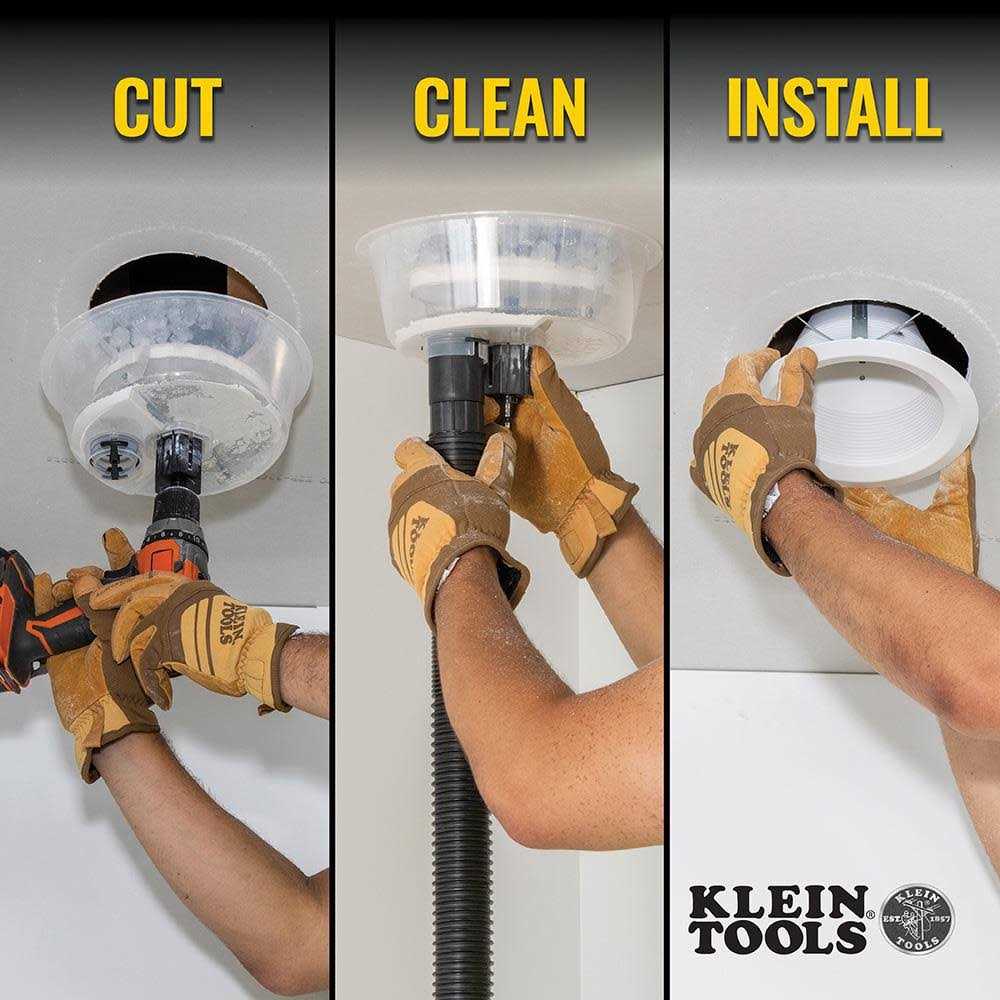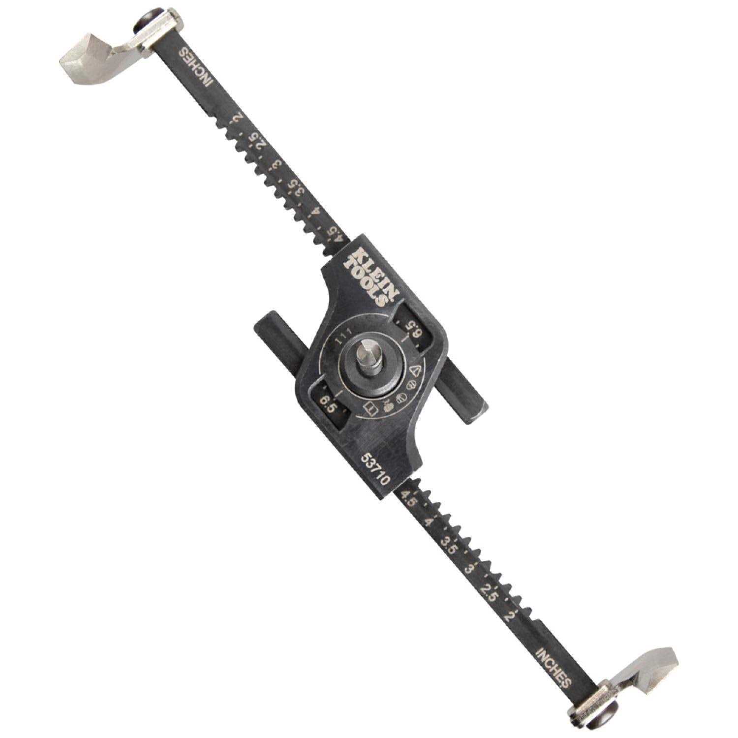 The Klein Tools Adjustable Hole Saw with Auto-Set Arms offers quick and precise hole cutting from 2 in. to 7 in. (5.1 cm to 17.8 cm) in drywall and ceiling tile. It features an integrated gearing mechanism for fast, simultaneous size adjustment and to ensure your pilot bit is always centered for clean cuts. The spring-loaded collar ensures controlled cuts, while the durable polypropylene dust bowl with integrated vacuum port allows for effective debris containment and effortless cleanup.