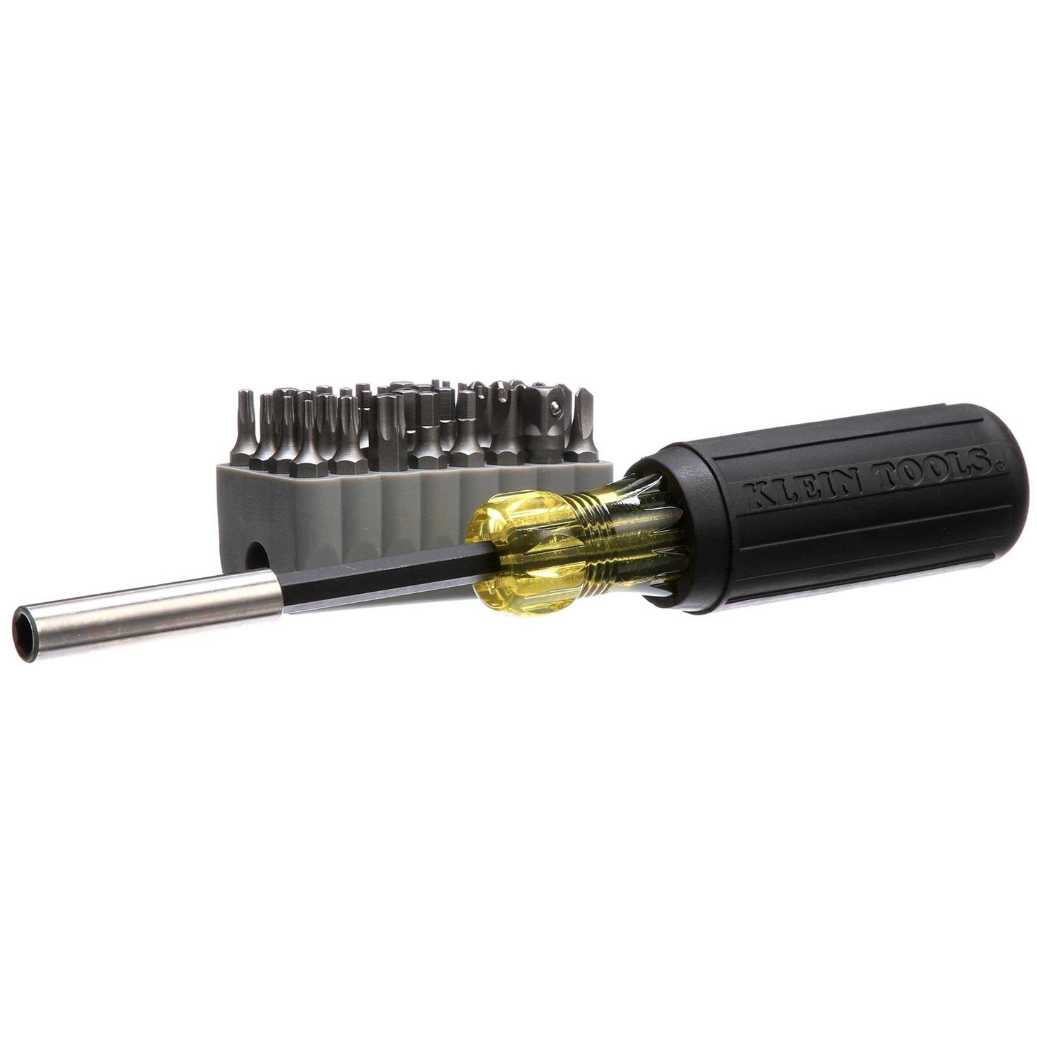 The Klein Tools Magnetic Screwdriver Set with 32 pieces provides tamperproof reliability and the flexibility to tackle a variety of jobs. A Cushion-Grip handle offers greater torque and comfort while the industrial strength steel bits lend long-lasting durability. For added convenience, a gray PVC storage block is included for trouble-free bit storage.WARNING Always wear approved eye protection. Do NOT use to pry or chisel. NOT insulated. Will NOT protect against electrical shock. NOT insulated. Will NOT protect against electrical shock.