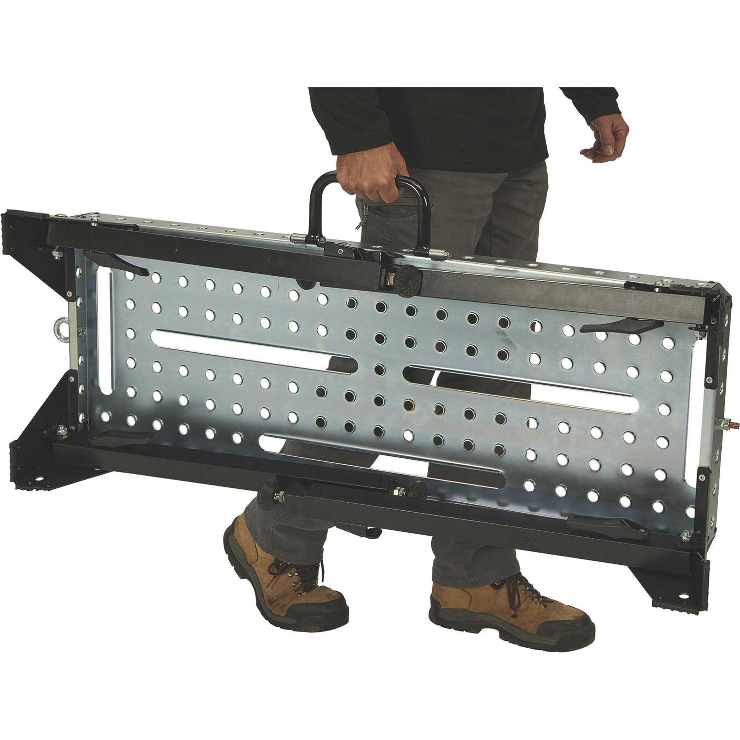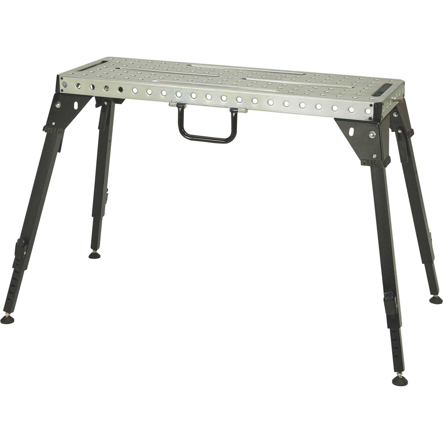 Capacity, Height-Adjustable Steel Welding Table features foldable legs and 10 height adjustments. The 15-gauge (1.8mm) steel tabletop ensures strength and durability. Standard 16mm holes are evenly spaced 2in. apart for exceptional flexibility in fixture setup. Use this table folded up as a top for an existing worktable or as a 36in.H freestanding welding station. The conveniently located ground stud is designed for connecting grounding clamps and leads. Add the 32-pc. workhold accessory base kit or the 4-pc. welding table clamp kit (Item# 102883 or Item# 102884, both sold separately) to give your steel welding table even more functionality and versatility. Adjustable: Yes, Dimensions L x W x H (in.): 46 x 18 x 28.5, Frame Material: Steel, Length: 46 in, Mobile: No, Pieces (qty.): 1, Product Type: Table, Product Weight: 42.6 lb, Table Top Material: Steel, Weight Capacity: 1,000 lb, Width: 18 in 15-gauge (1.8mm) steel tabletop for strength and durability43in.- W x 15.75in.- D x 2.36in.- H tabletop board with glossy zinc plated finish16mm holes evenly spaced 2in. apart for setup flexibility1in. wide slots for plasma cutting or holding materials for easy clamping10 adjustable heights from 28.5in.- H to 36in.- H1000-Lb. capacity- Overall size: 40in.- L x 24in.- W x 28.5–36in.- H