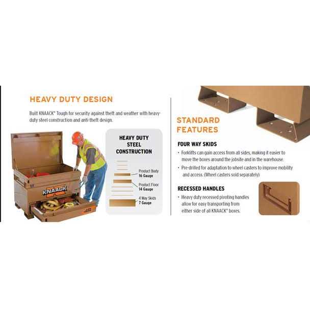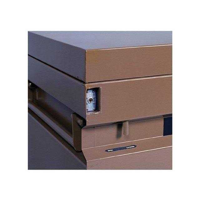 The tan jobsite chest from Knaack provides the secure storage you need for all your tools and materials. This 36″ x 19″ x 16″ jobsite chest has a capacity of 7 cu. ft. The 16 gauge construction is strong and sturdy. Features of this jobsite chest include: electrical pass-through grommet for weatherproof power cord access, reinforced lock housing, staked and welded heavy-duty hinges, powder paint finish, abrasion, and scratch resistance, steel skids, fully arc-welded seams. The handle type is: recessed. A padlock enclosure locking system is in place for safety and convenience. It is made of steel material. Its hinged lid bolsters functionality and performance.