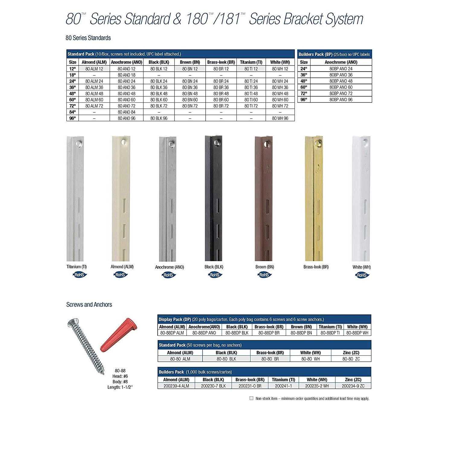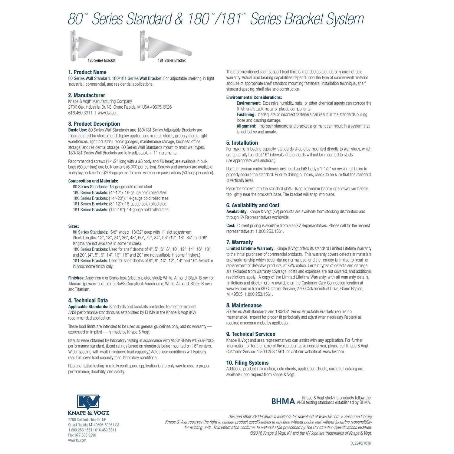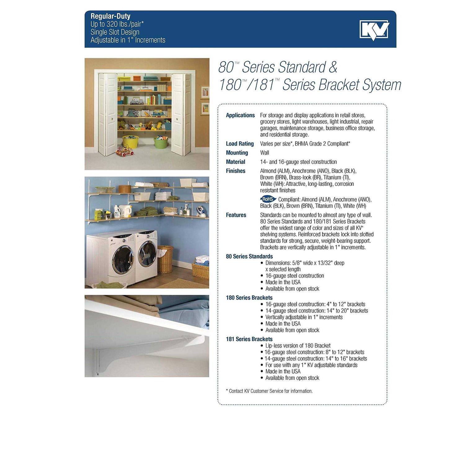 For use with the 80 Series standards. For shelving applications in light industrial, commercial, and residential use. Standards can be mounted to nearly any type of wall. For storage and display applications in retail stores, grocery stores, light warehouses, repair garages, maintenance storage, business office storage, and residential storage. Reinforced brackets lock into slotted standards for strong, secure weight-bearing support. Fully adjustable in 1″ increments. 16-gauge cold rolled steel construction. Tested to meet or exceed ANSI performance standards as established by BHMA.