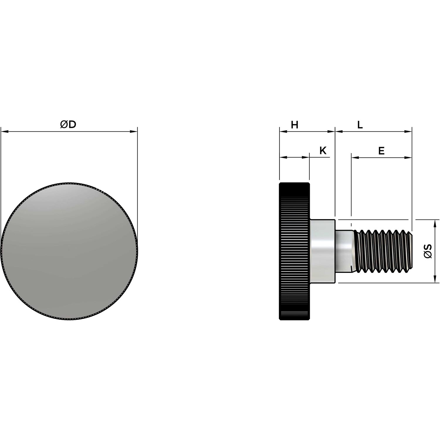The M5 x 20mm Knurled Thin Thumb Screws (DIN 653) – Black Stainless Steel (A1) has the following features:4mm Head Length (H), DIN 653 Manufacturing Standard, 20mm Length (L), Stainless Steel (A1) Material, Stainless Steel (A1) Material Specification, 0.8mm Pitch, Matte Black Finish, M5 (5mm) Thread Size, 5mm Shoulder Diameter, 20.42mm Head Diameter (D), Metric Metric or Imperial, 1mm Radius , +0/-0.84mm Head Diameter (D) Tolerance, +0/-0.3mm Head Length (H) Tolerance, +0/-0.18mm Shoulder Diameter Tolerance. Discover more about the Knurled Thin Thumb Screws – DIN 653 range. Thin Thumb Screws feature a knurled cylindrical head, and are designed to be easily adjusted by hand. The increased head diameter of a Thumb Screw allows these fasteners to be adjusted to a precise tightness by hand. DIN 465 Thumb Screws are also available with an unthreaded section below the head for captivation. The captive variant is available through our custom manufacture service. As an alternative product, Accu also offers a selection of Wing Screws, which are also designed to be adjusted by hand. Materials Components within this range are available in a number of specialist materials, including A1, A2 and A4 Stainless Steel, Brass, Phosphor Bronze, Nylon and PEEK. Additional features such as Chemical Blackening and Thread Locking Patches can also be applied to these products. Metric Thumb Screws Slotted Thumb Screws are manufactured according to DIN 465, and are available in metric diameters of between M2 and M10, and in lengths from 4.00mm up to 40.00mm. Additional sizes can be custom manufactured on request.