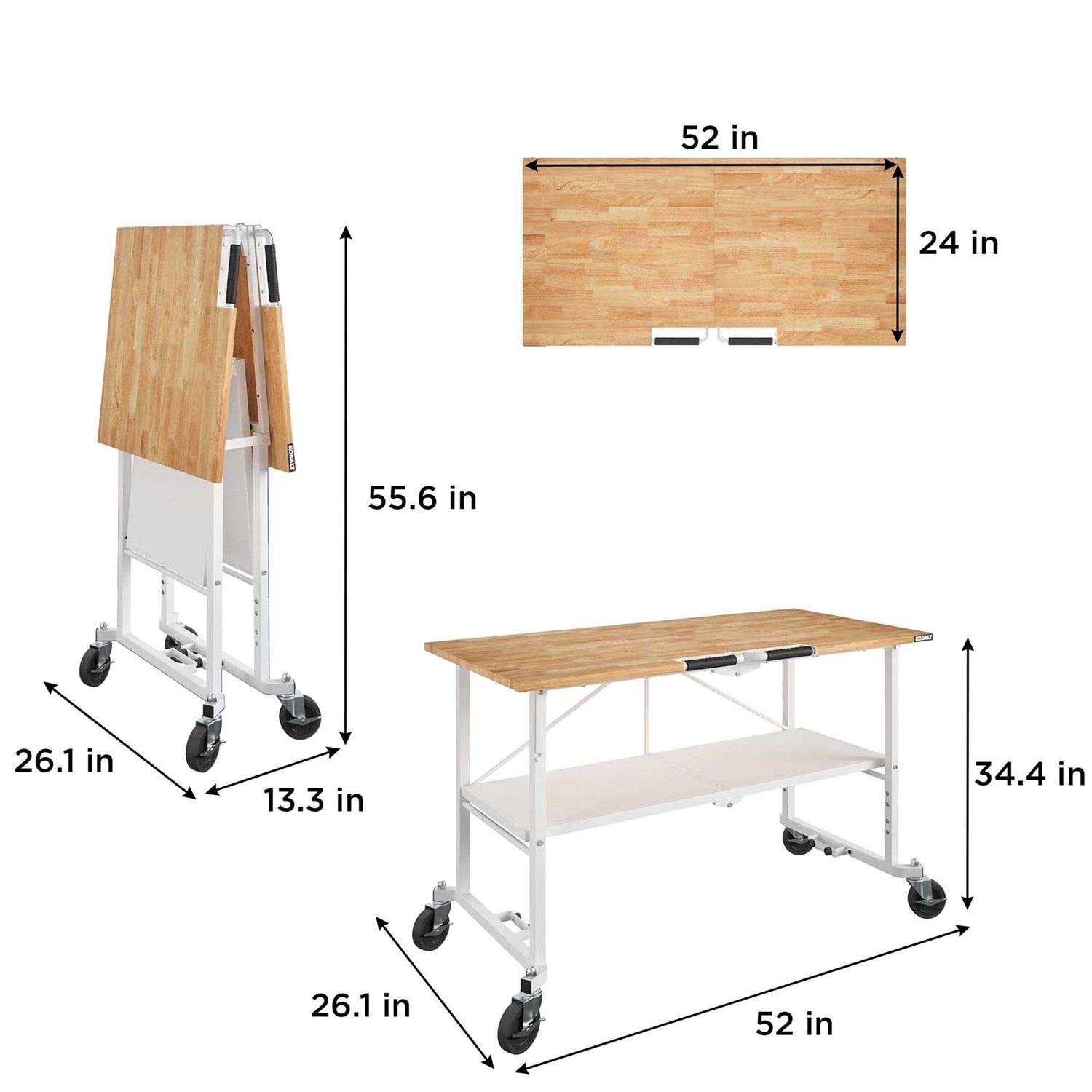 Take this folding portable workbench anywhere the work is. When your work is done, simply fold and store away. Made with industrial-strength steel, this utility table has a weight capacity of 400 pounds on the hard wood top shelf and 300 pounds on the bottom shelf. The four locking casters allow you to keep the workbench in place while you work. It folds in seconds, saving you time and storage space. With a large working surface and a place to store your tools, this versatile workbench is ready to handle any DIY project.